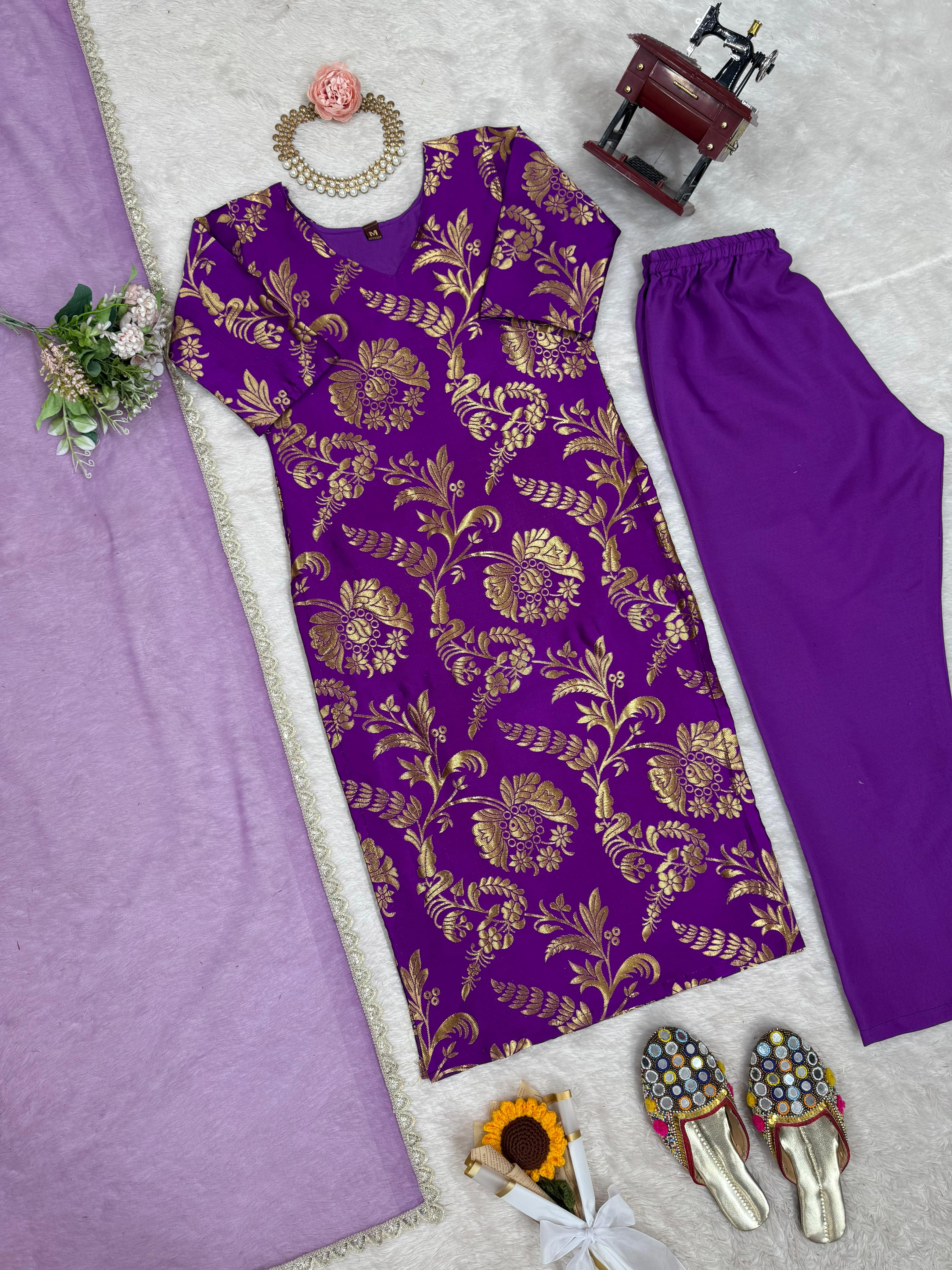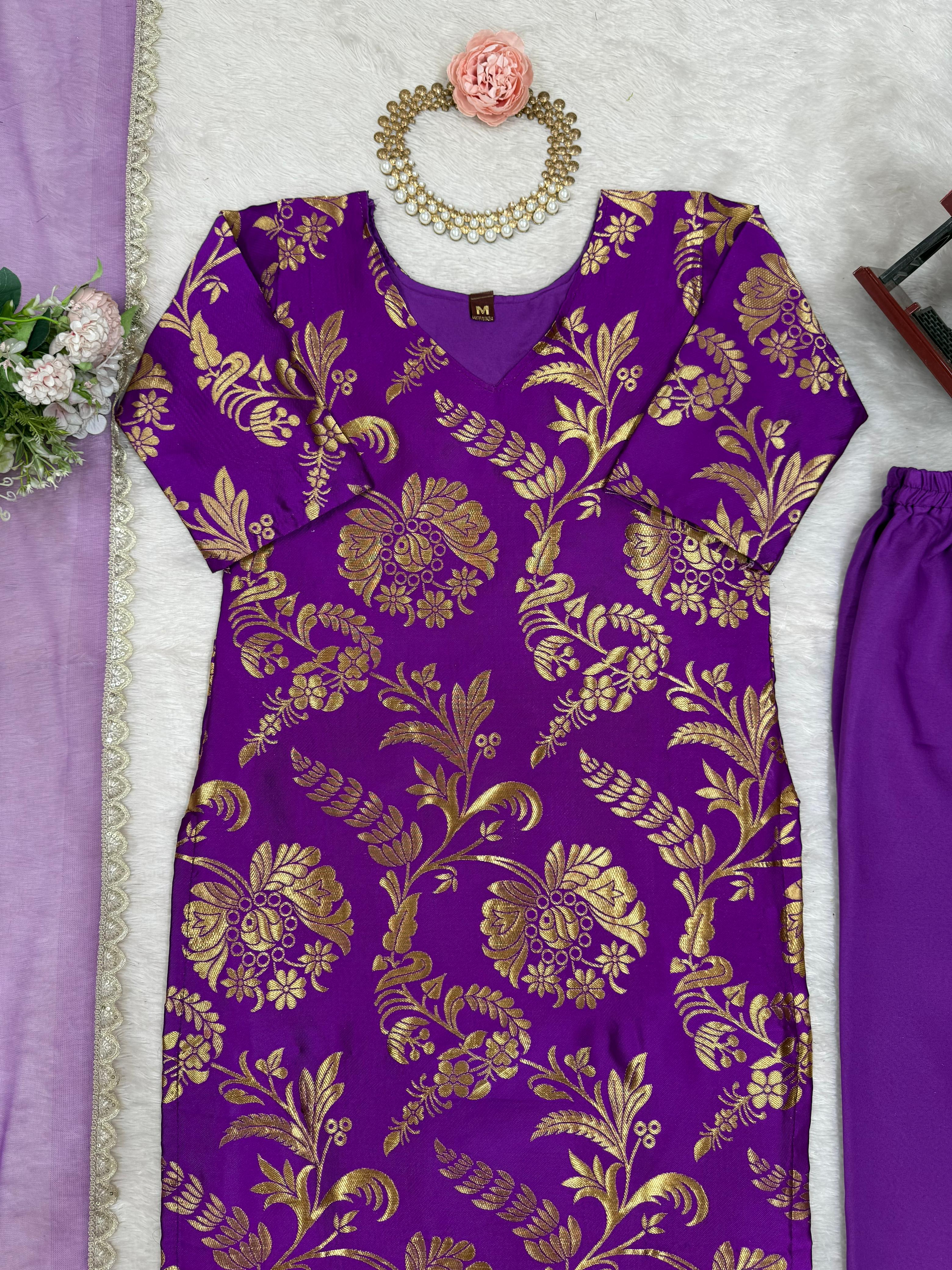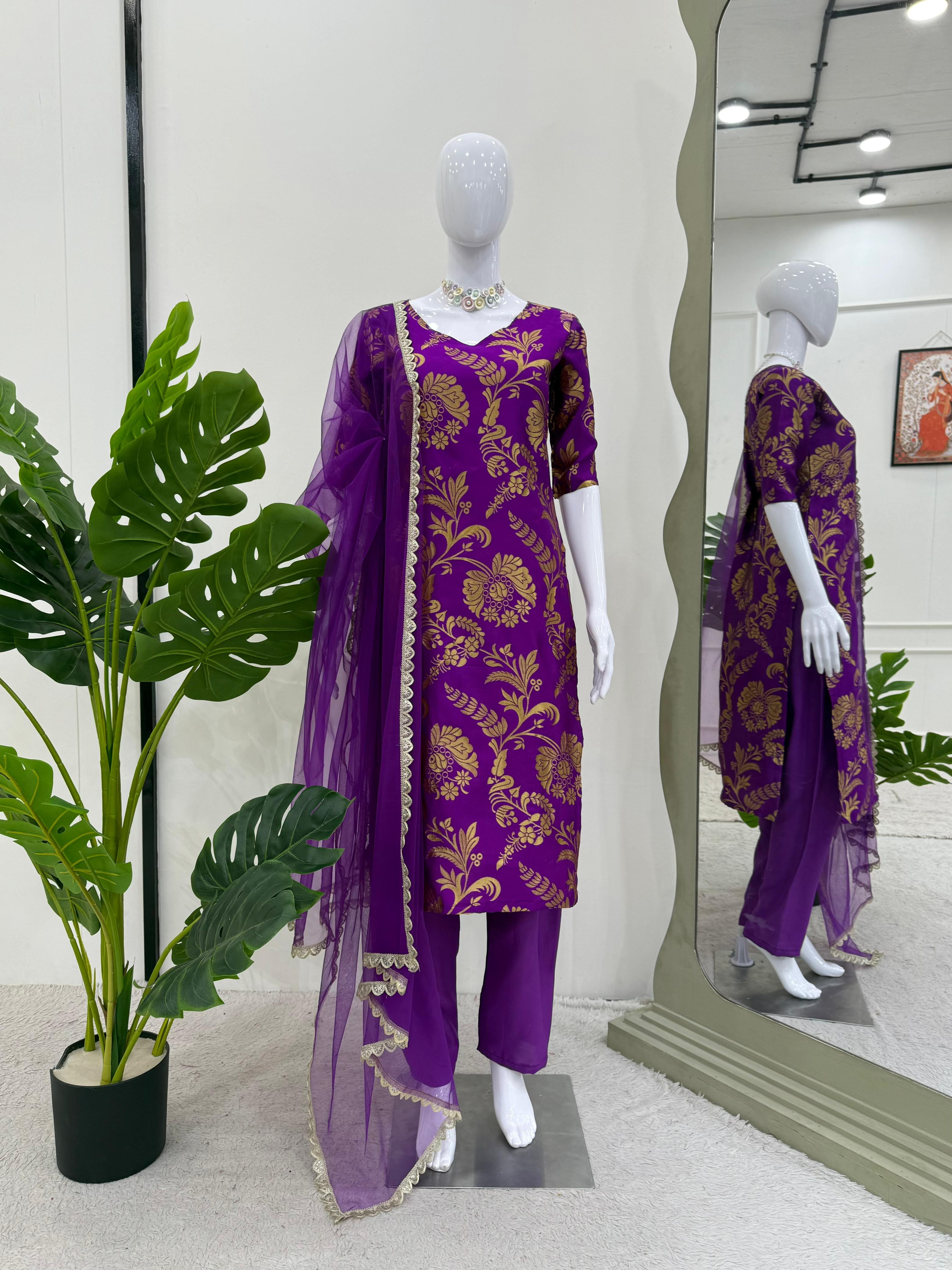 Looking for this same colour beautiful Designer Suit on jacquard Silk fabric and Pent on Natural crep febric and Dupatta on Soft net Fancy Lace work