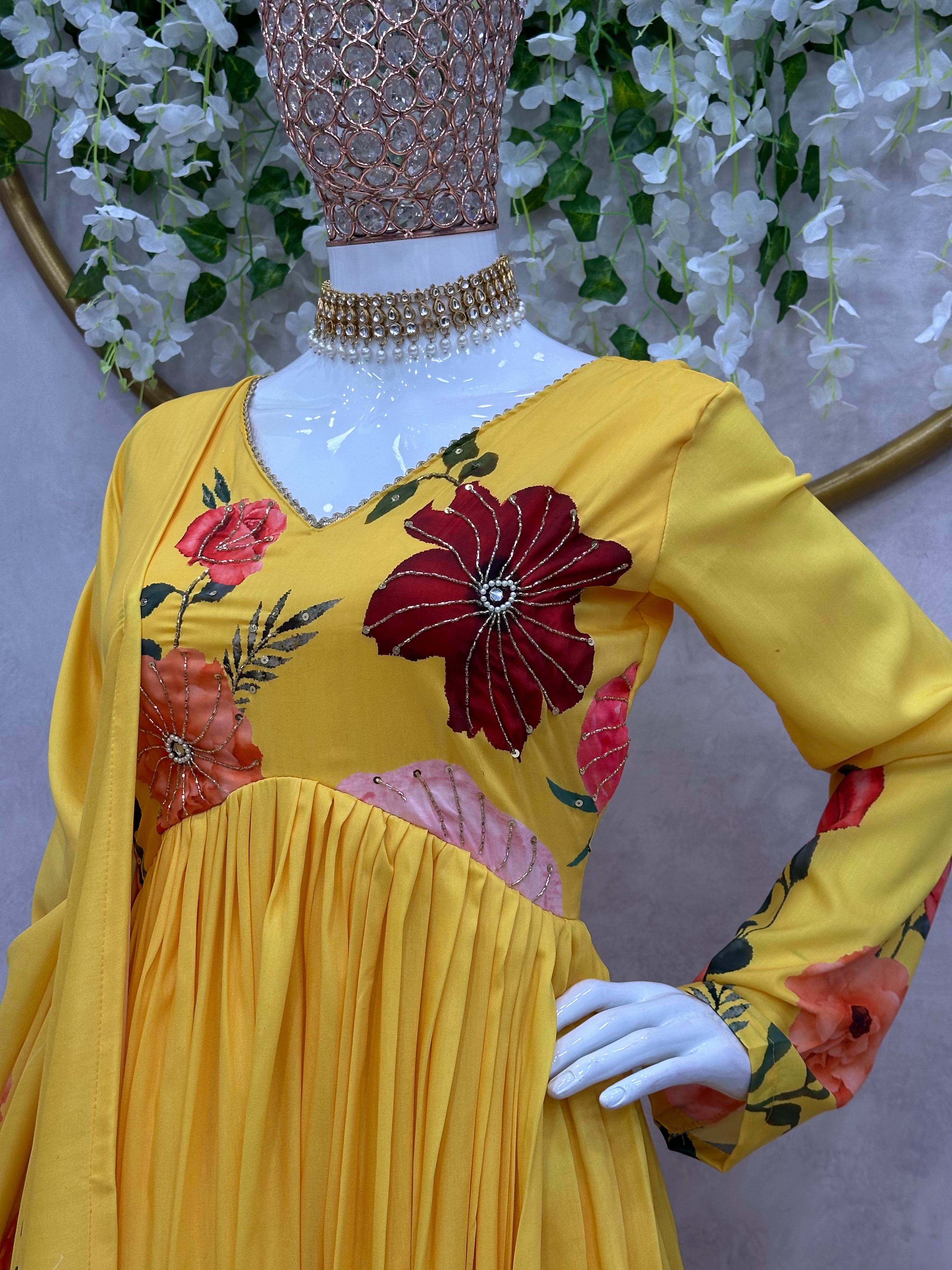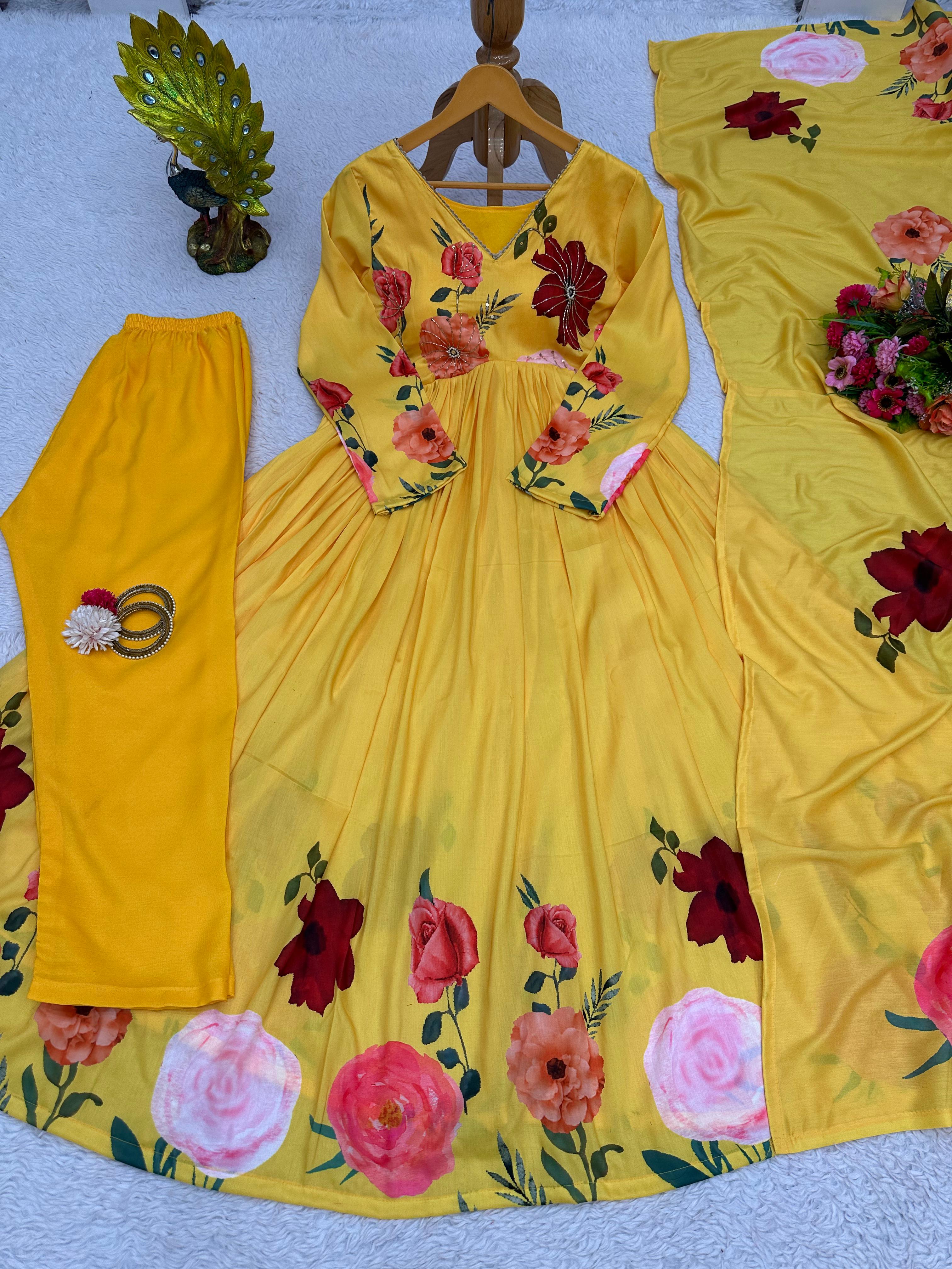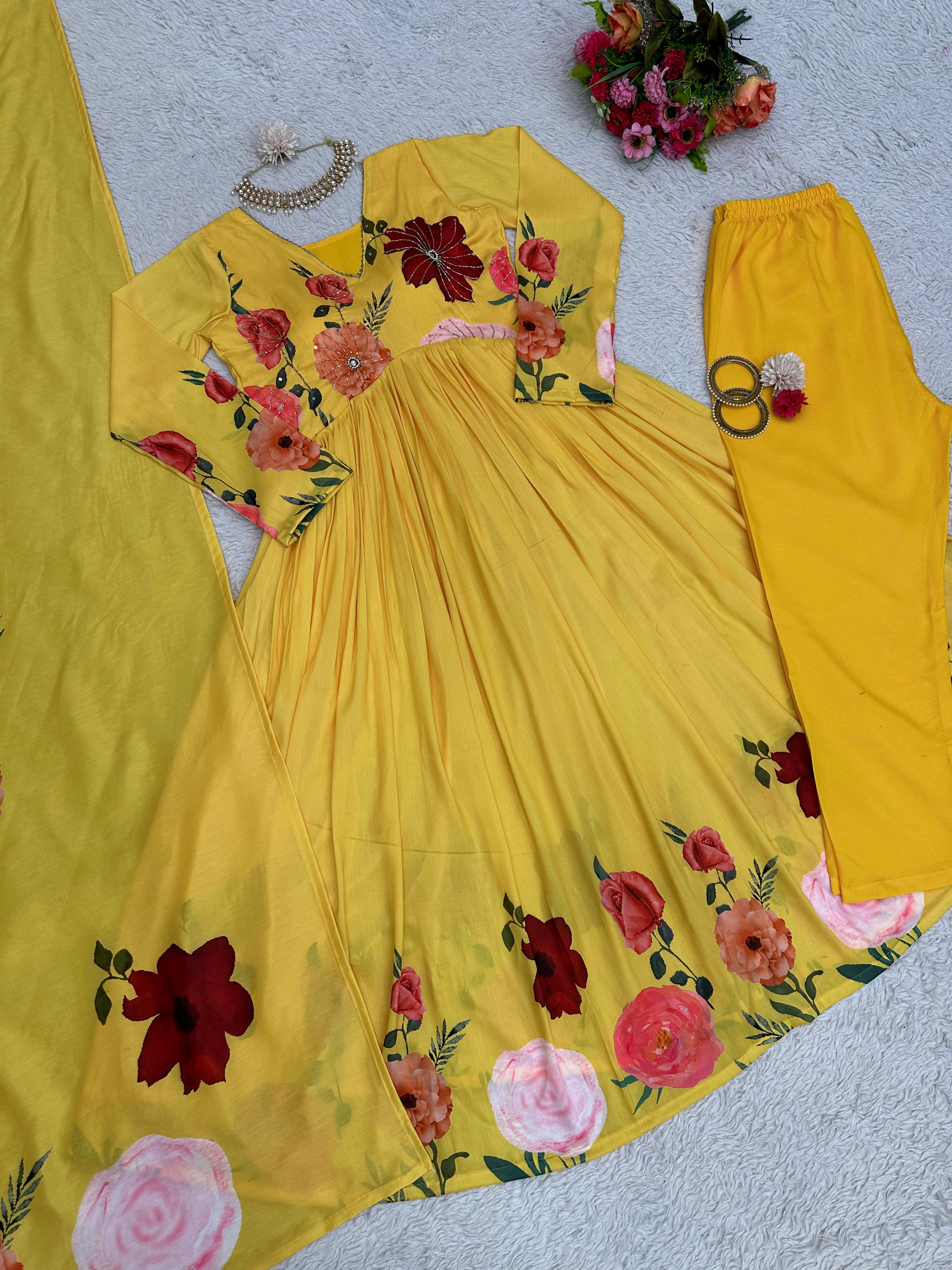Looking for this same colour beautiful Designer Side Cut Suit On Muslin febric with inner and Digital print with Hand work and Pent With Crep Febric and Dupatta on also Muslin Febric With Digital Print.