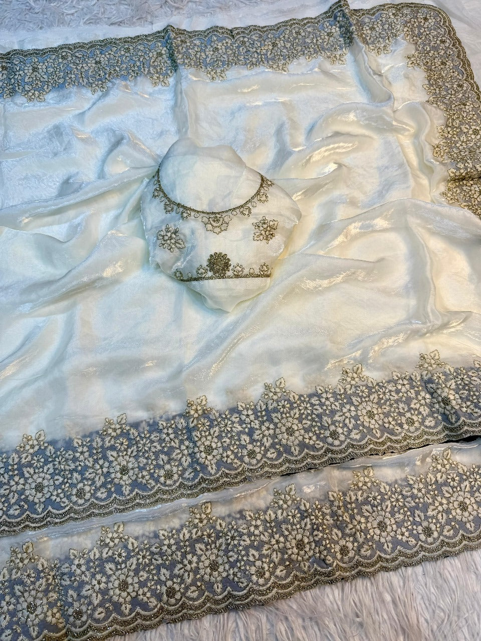Saree:- Pure Fandy Satin Silk With White Coding with Heavy Shine Embroidery work with Cut work border