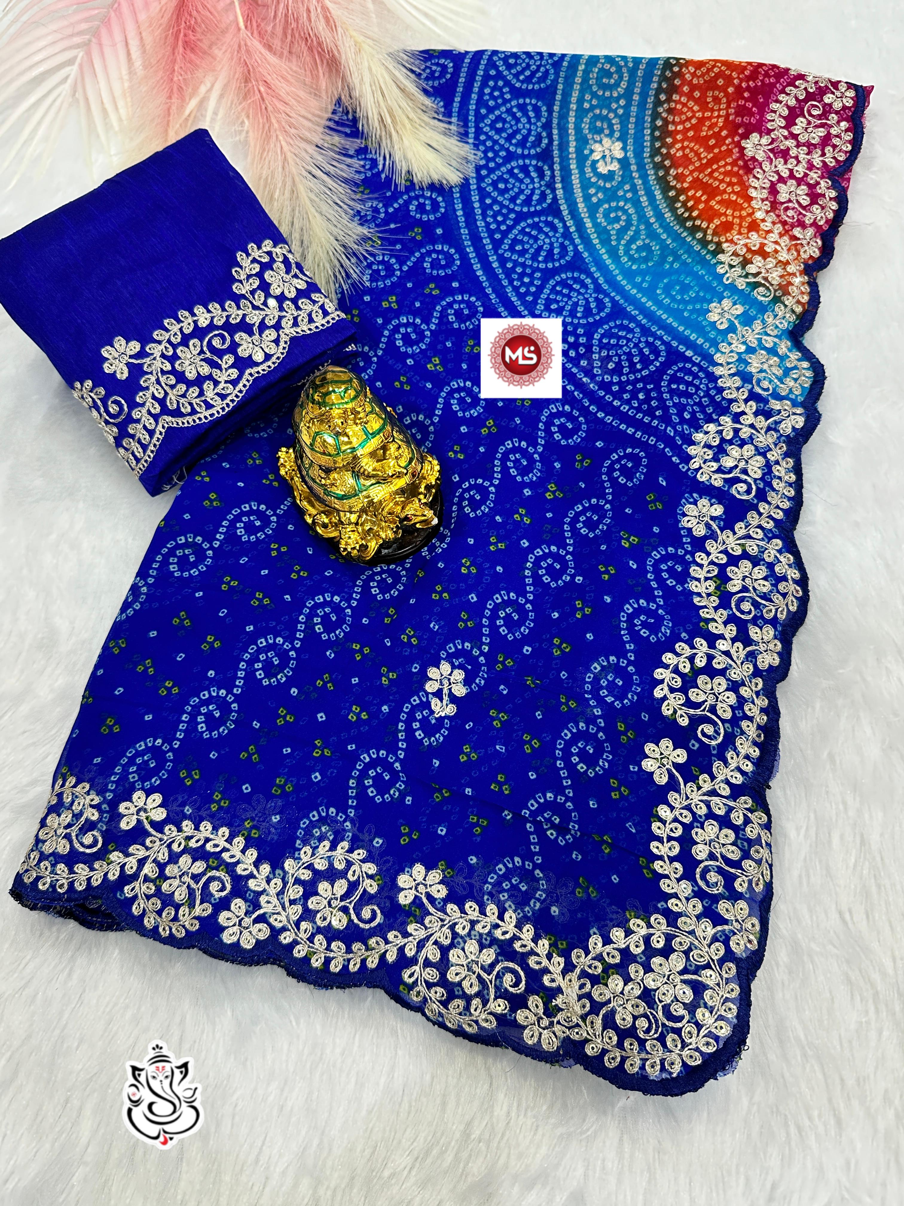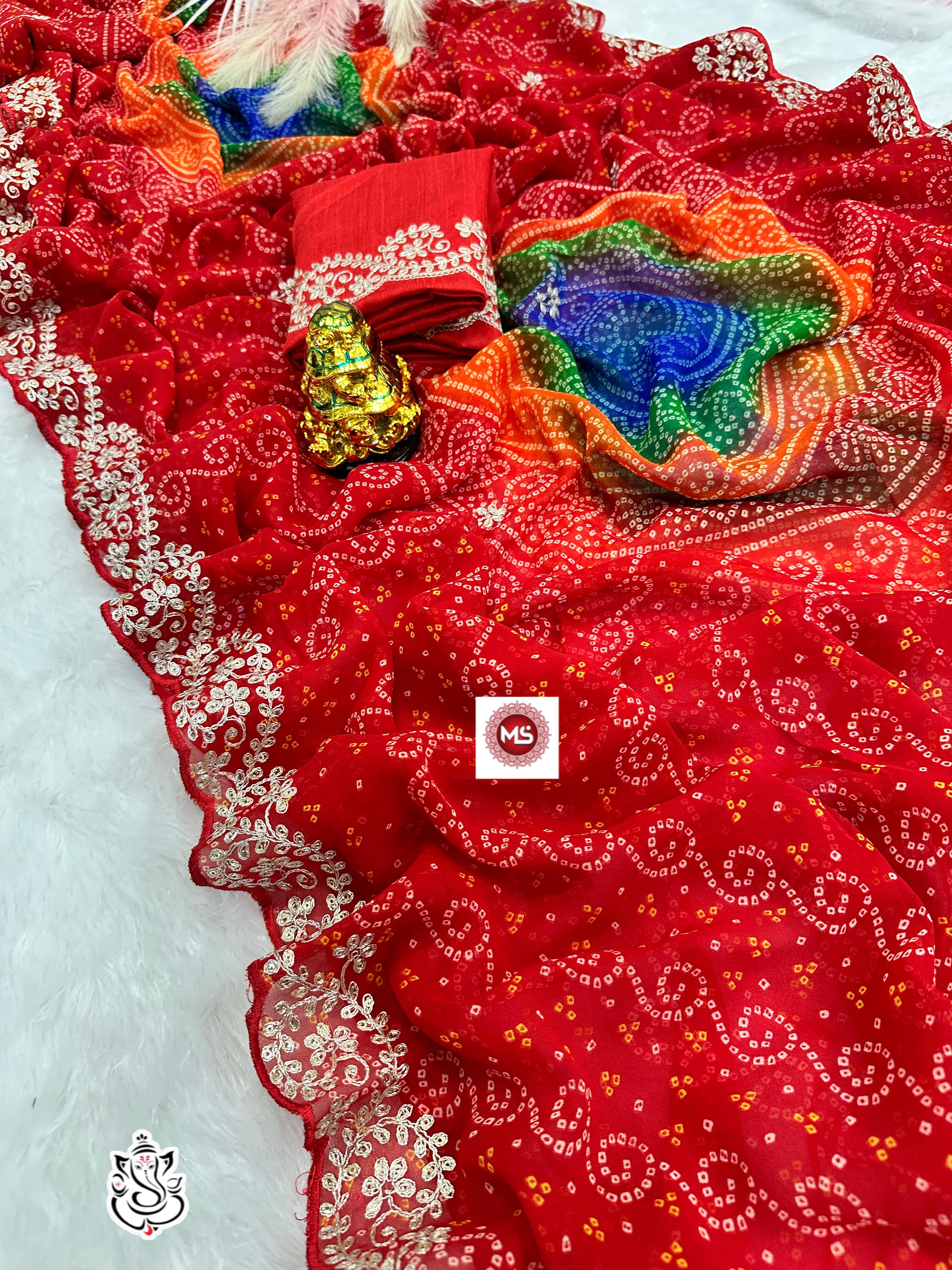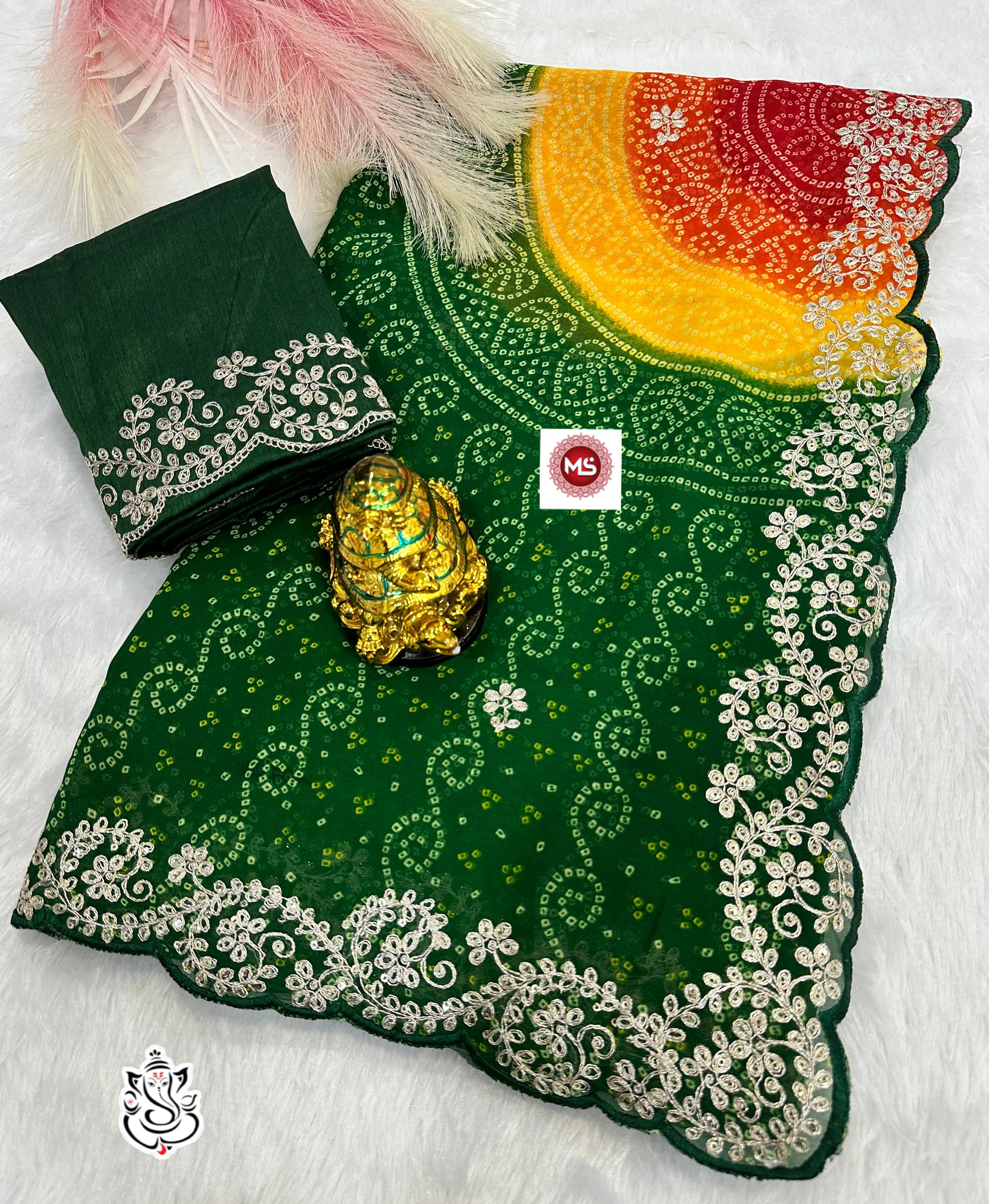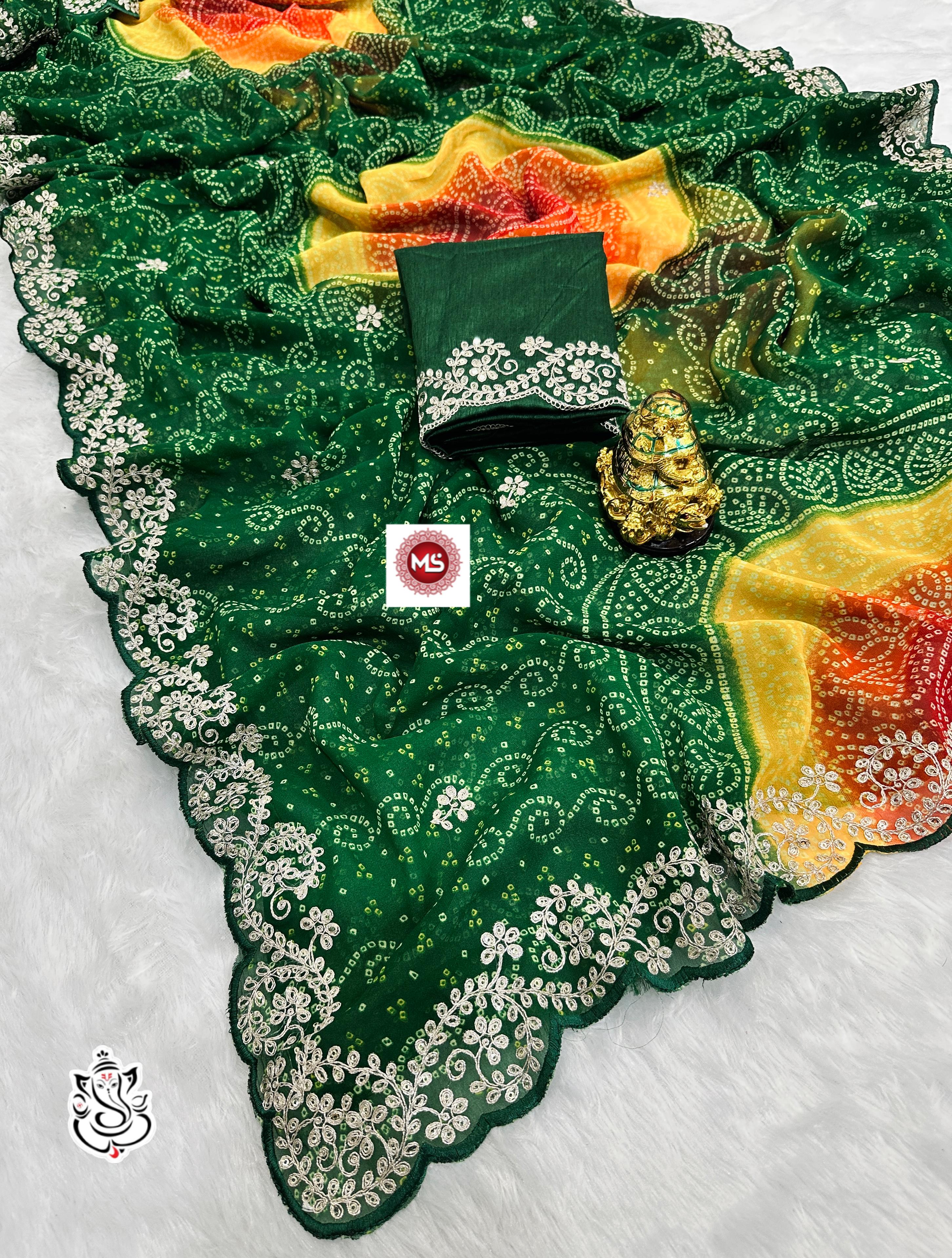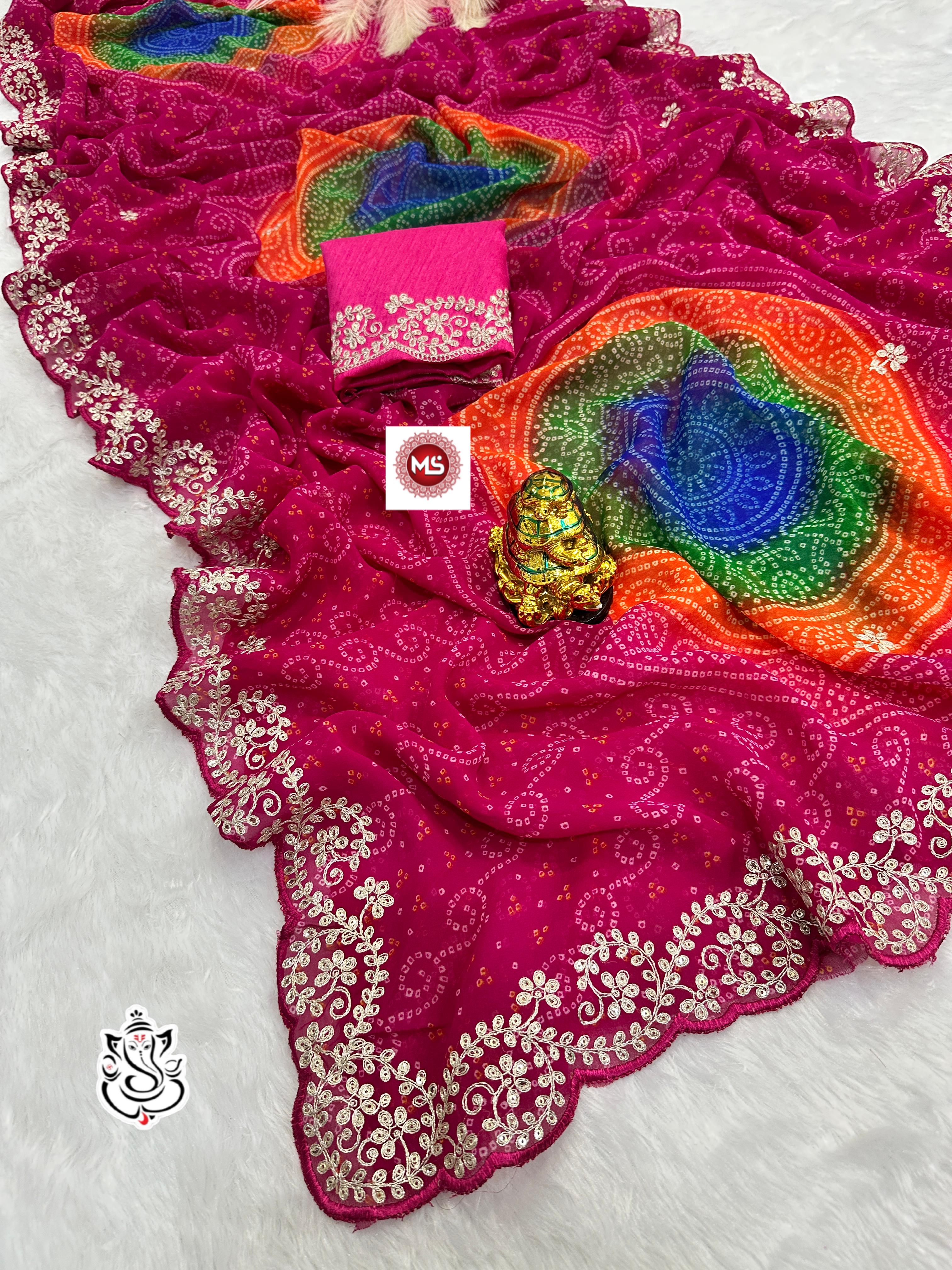 Fabric nd work :- beautiful soft c*c Georgette bandhej multi color print saree with rich look pitta work with sequence work nd butti in whole saree