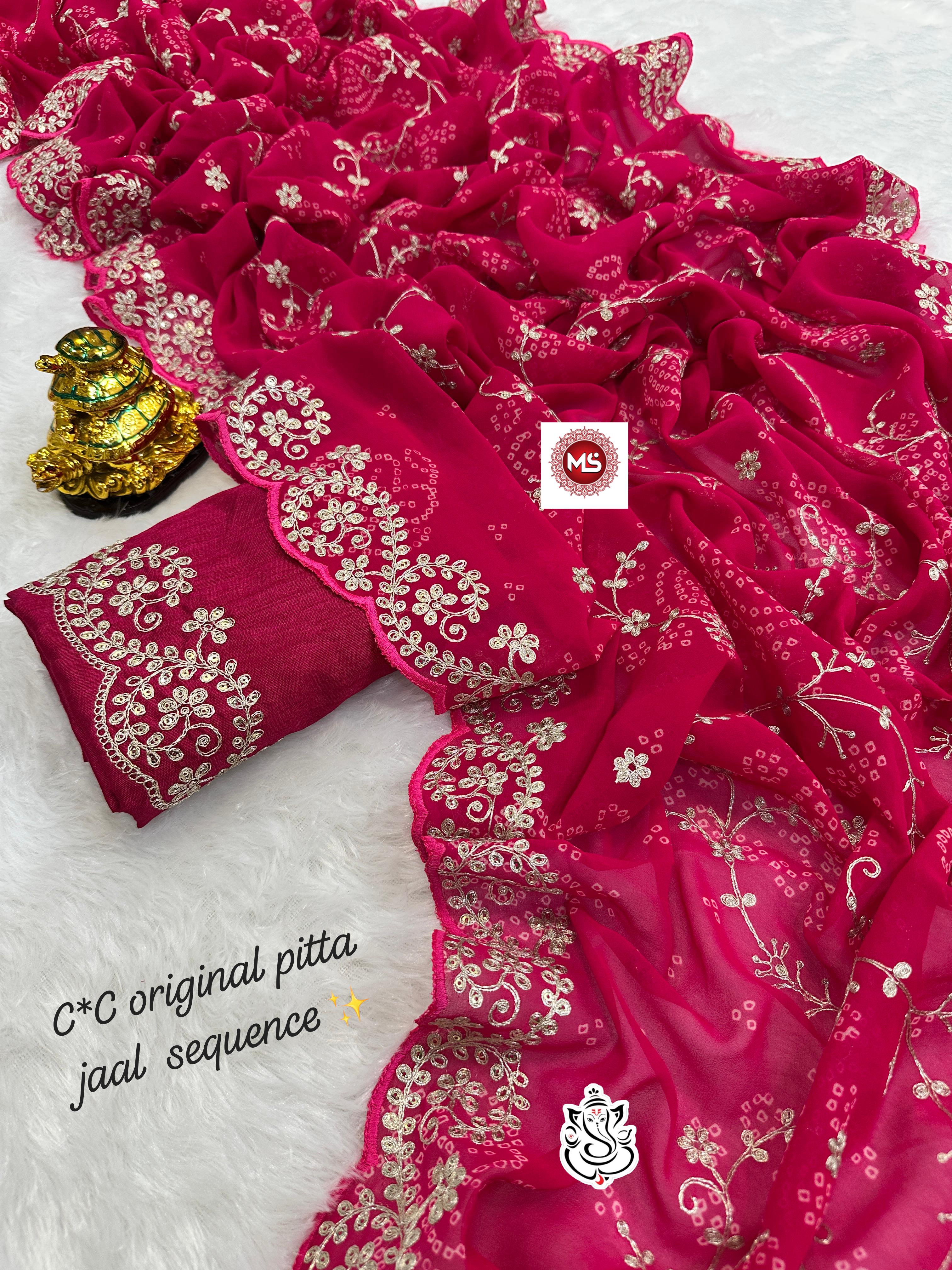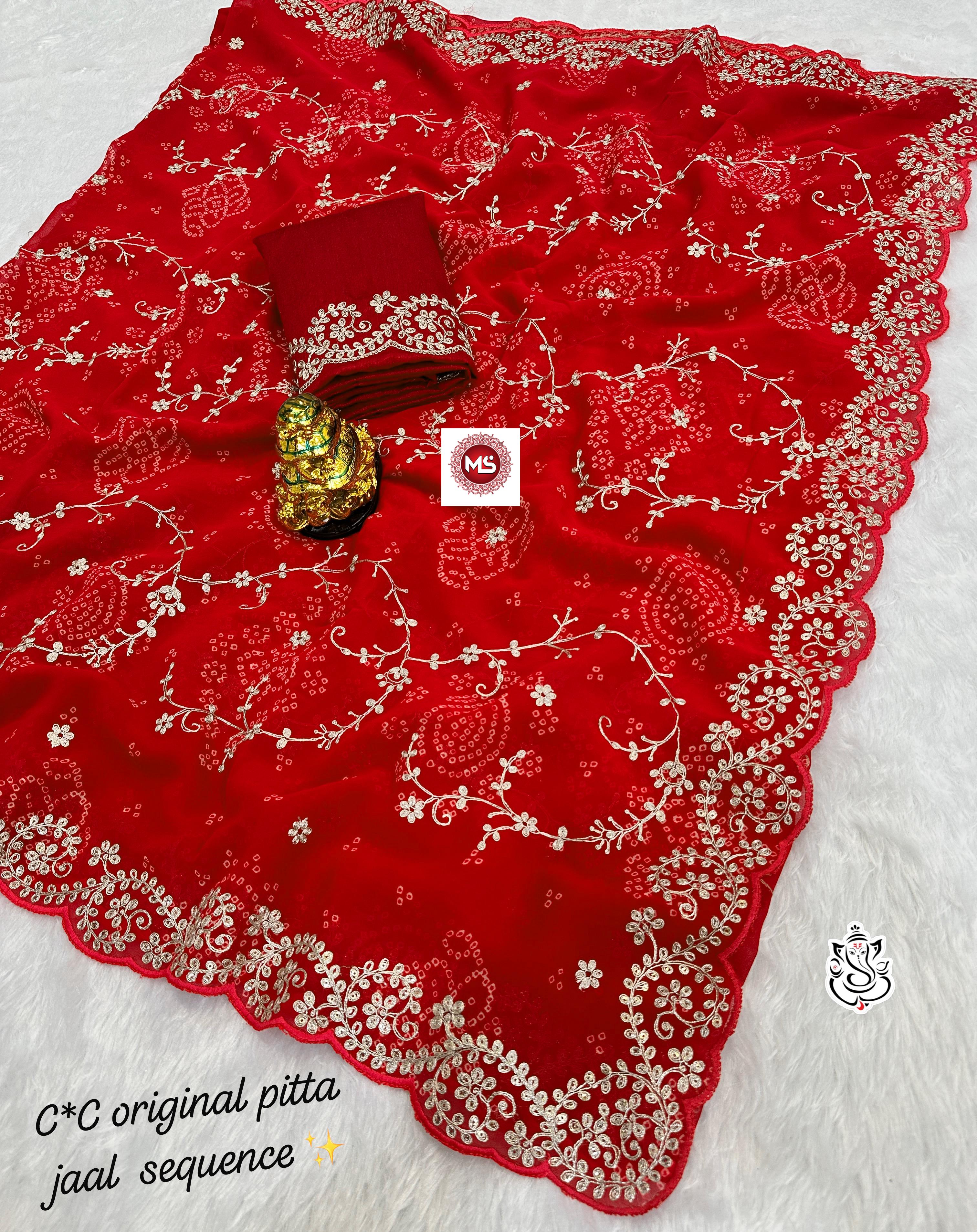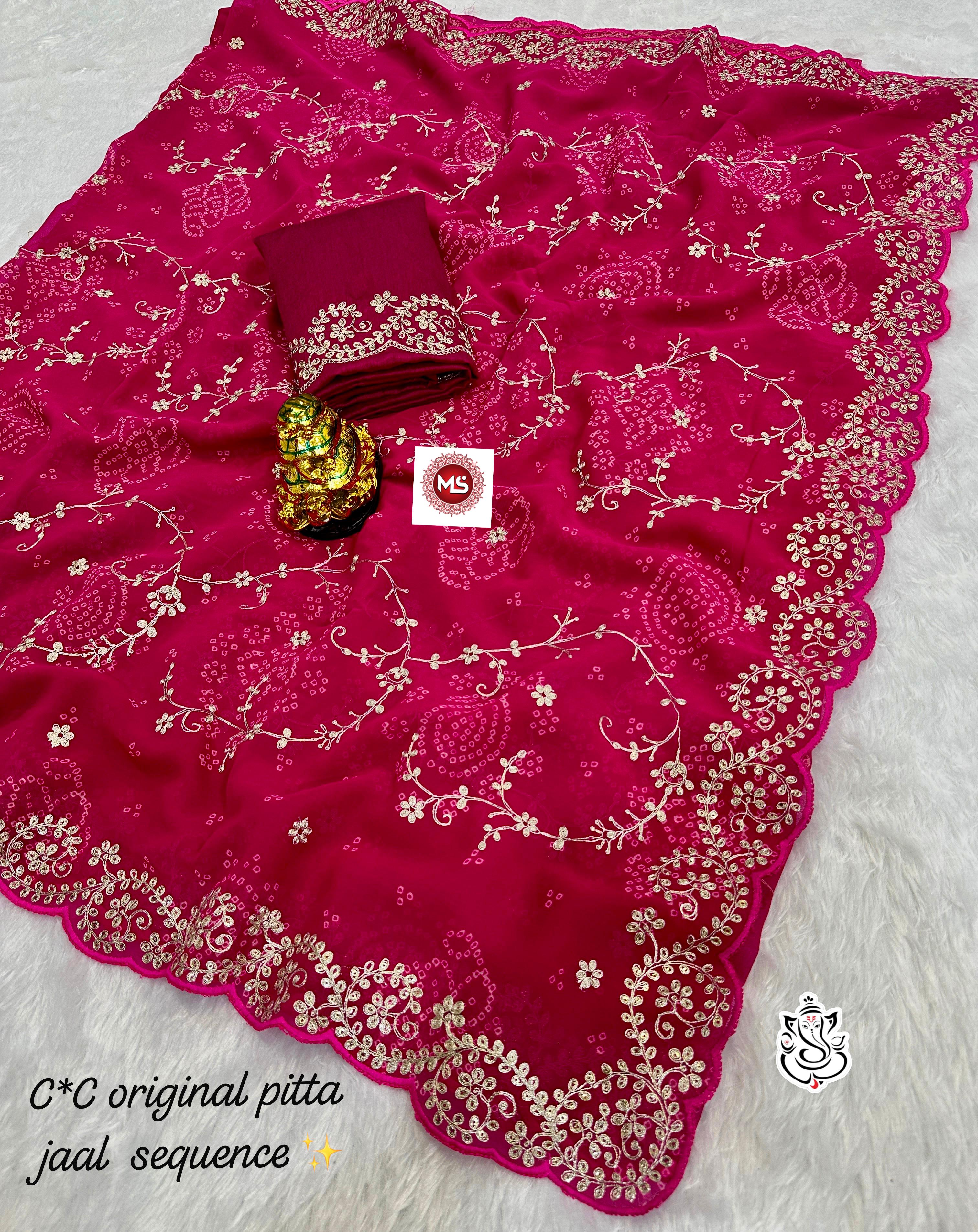 additional details-: saree have full original pita c.Pallu emb work..also having beautiful border cutwork border..also added with emb pita zari work blouse ..saree have extra ordinary sawan lehriya mill print pattern in best quality ..