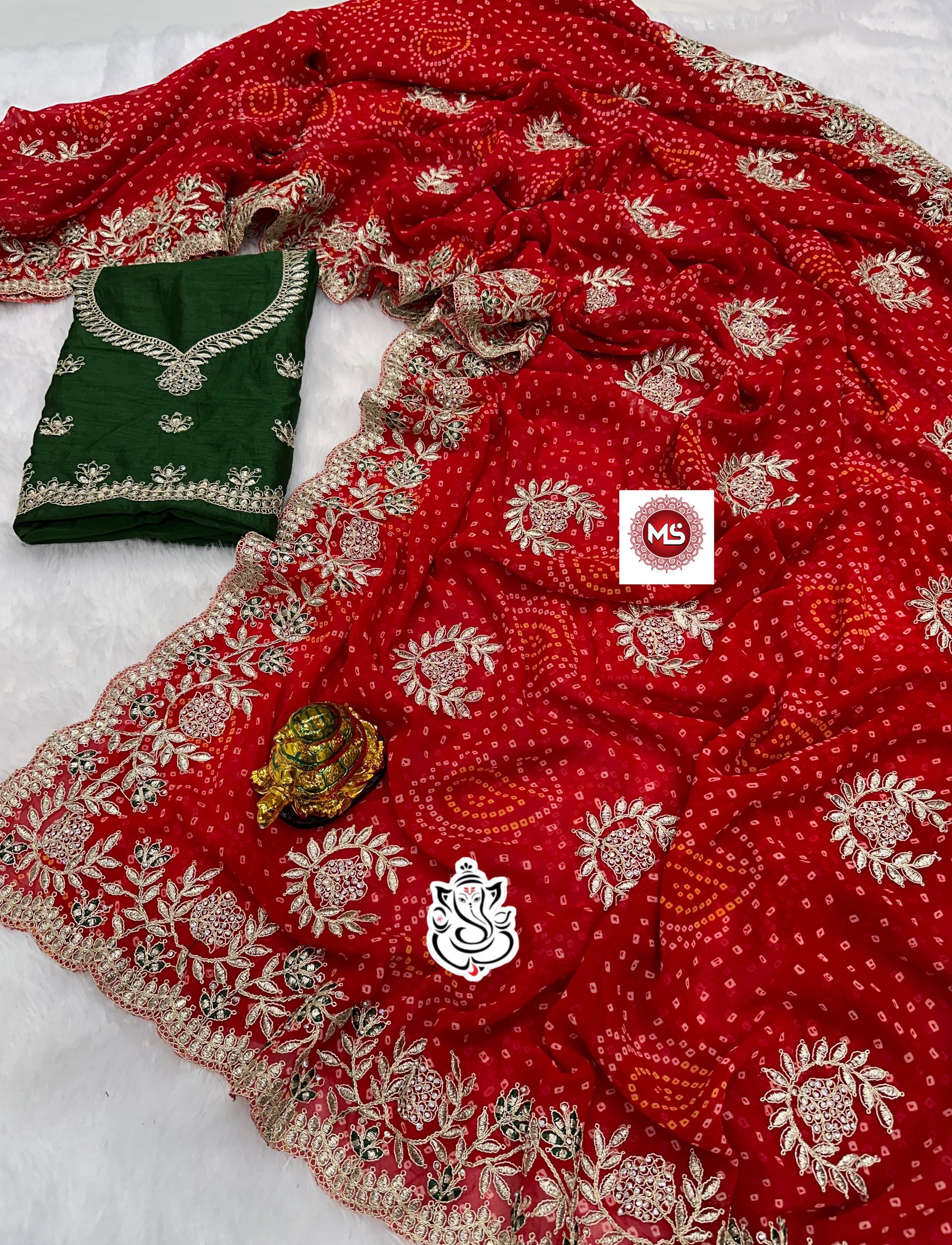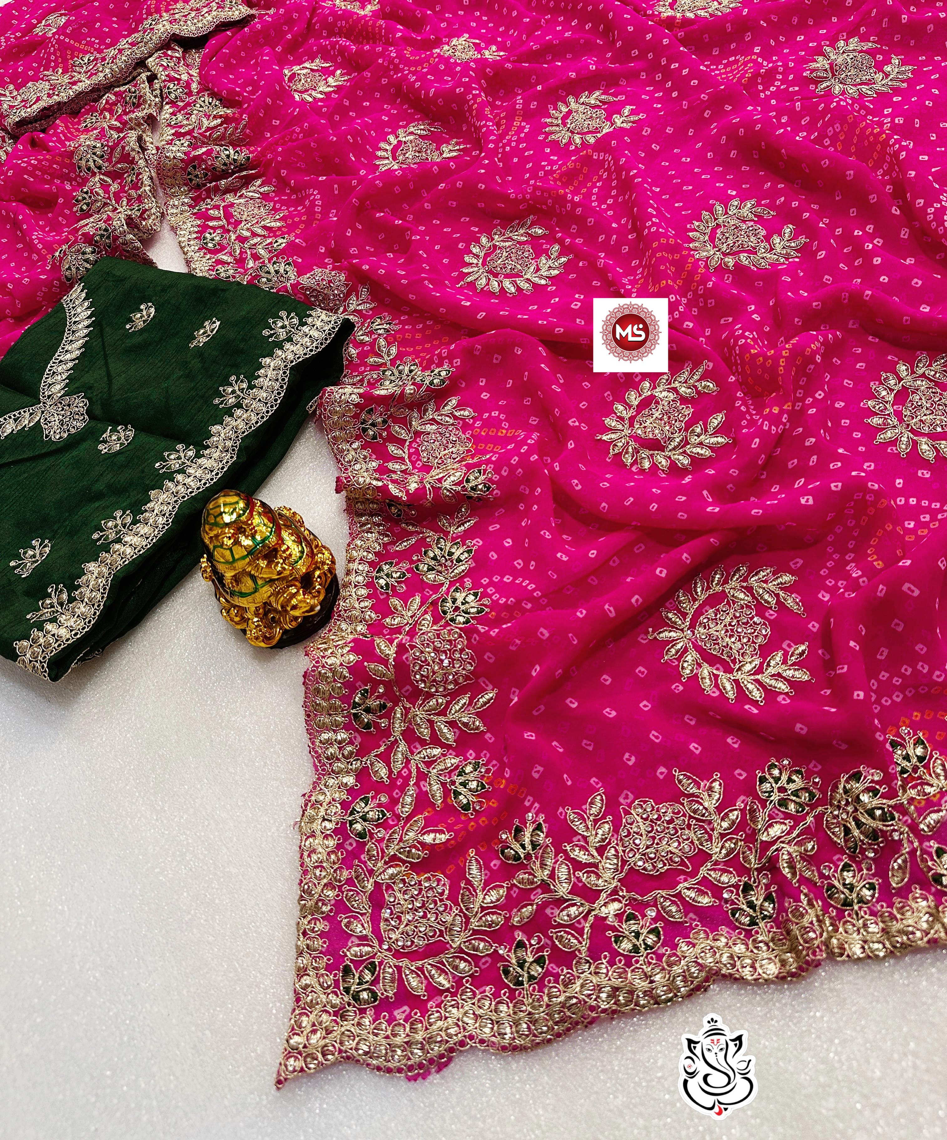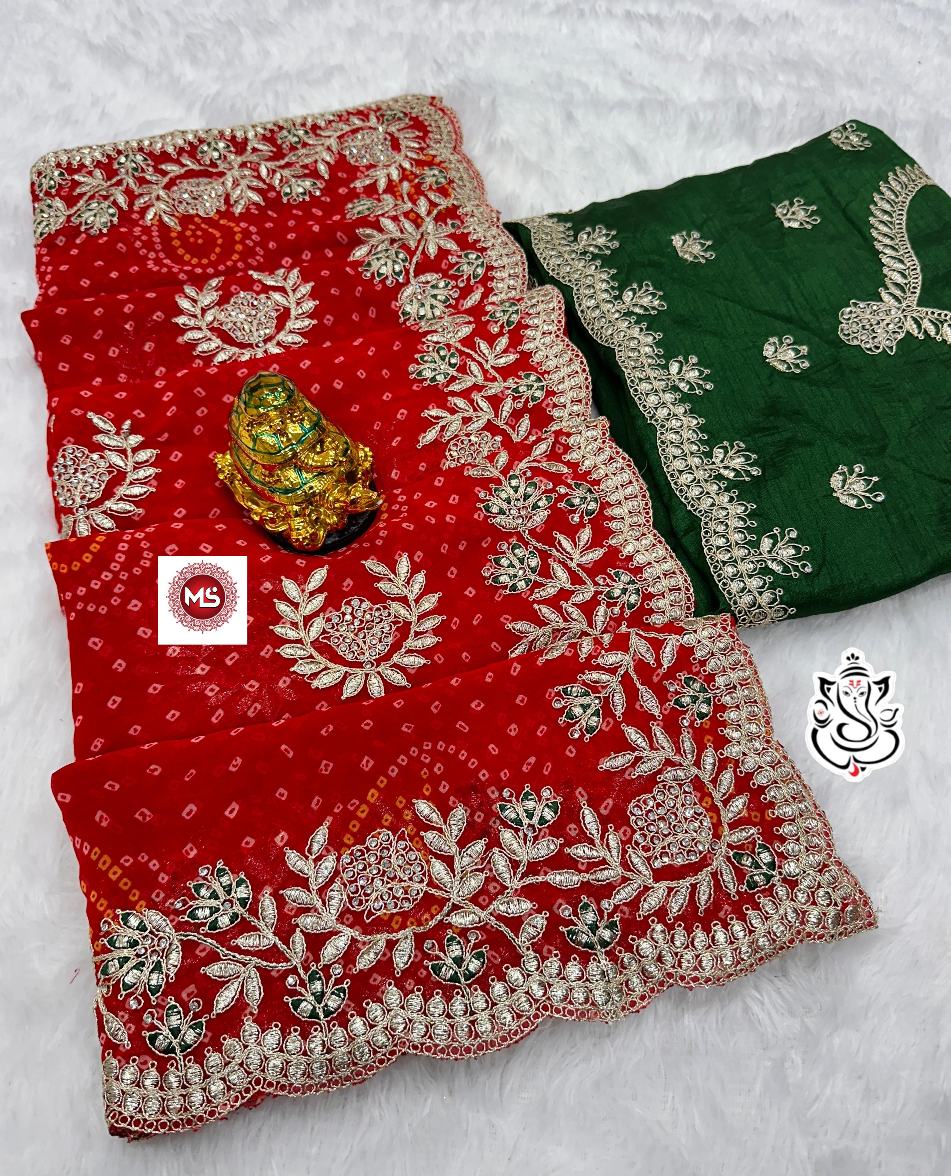Saree fabric- heavy c*c ORIGINAL Georgette bhandhini print saree with heavy gota patti c.pallu work with heavy jarkan diamonds work full in whole saree