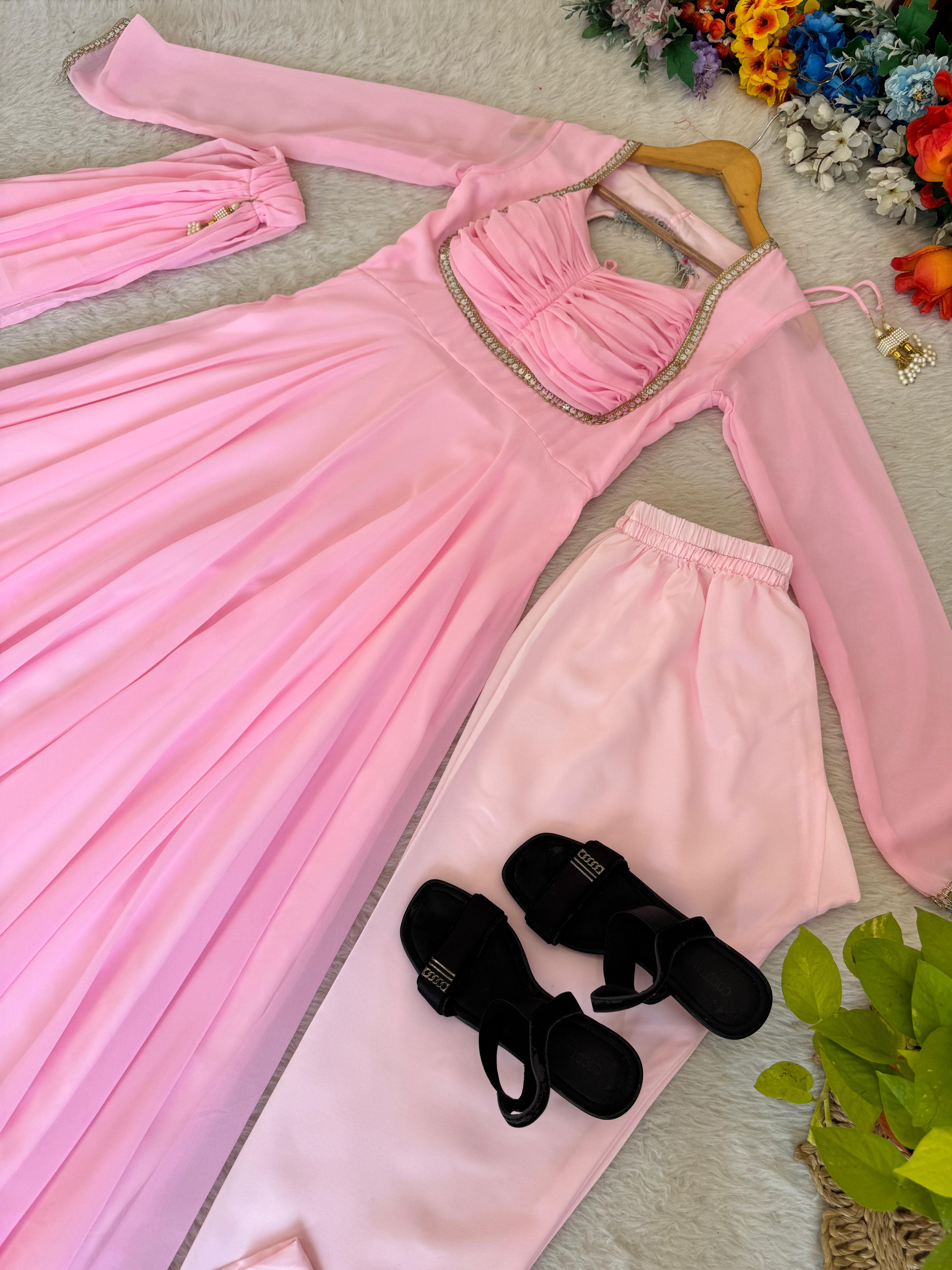 👗💥💥Presenting By New Party Wear Look Fox Gerorrget Gown With Dupatta , pant , 9MM Rembo sequence with Zari