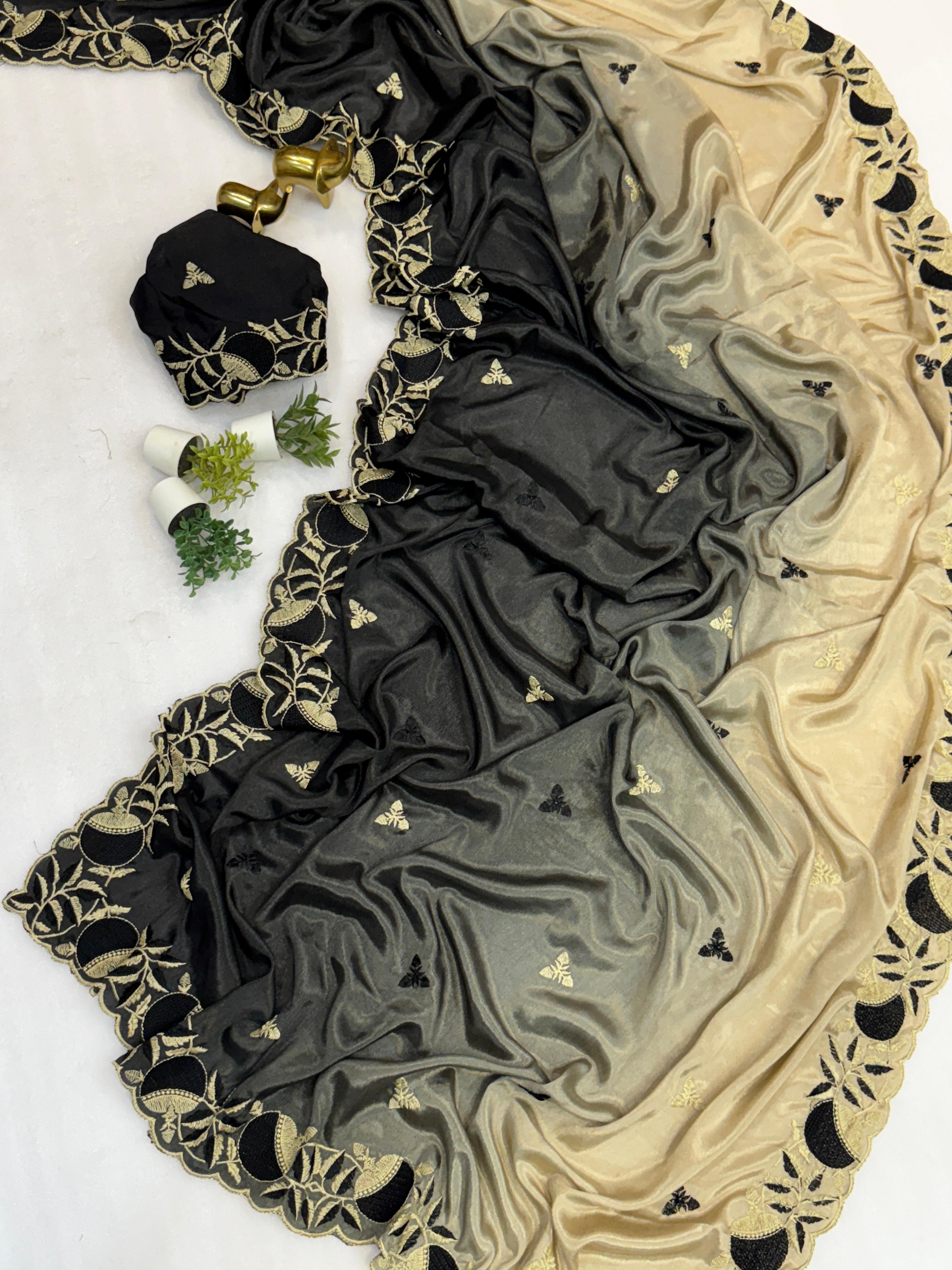 Pure soft silk chinon saree in a double colour shaded with Multi embroidery thread work in saree Paired with soft chinon silk blouse of same color of saree with embroidery work