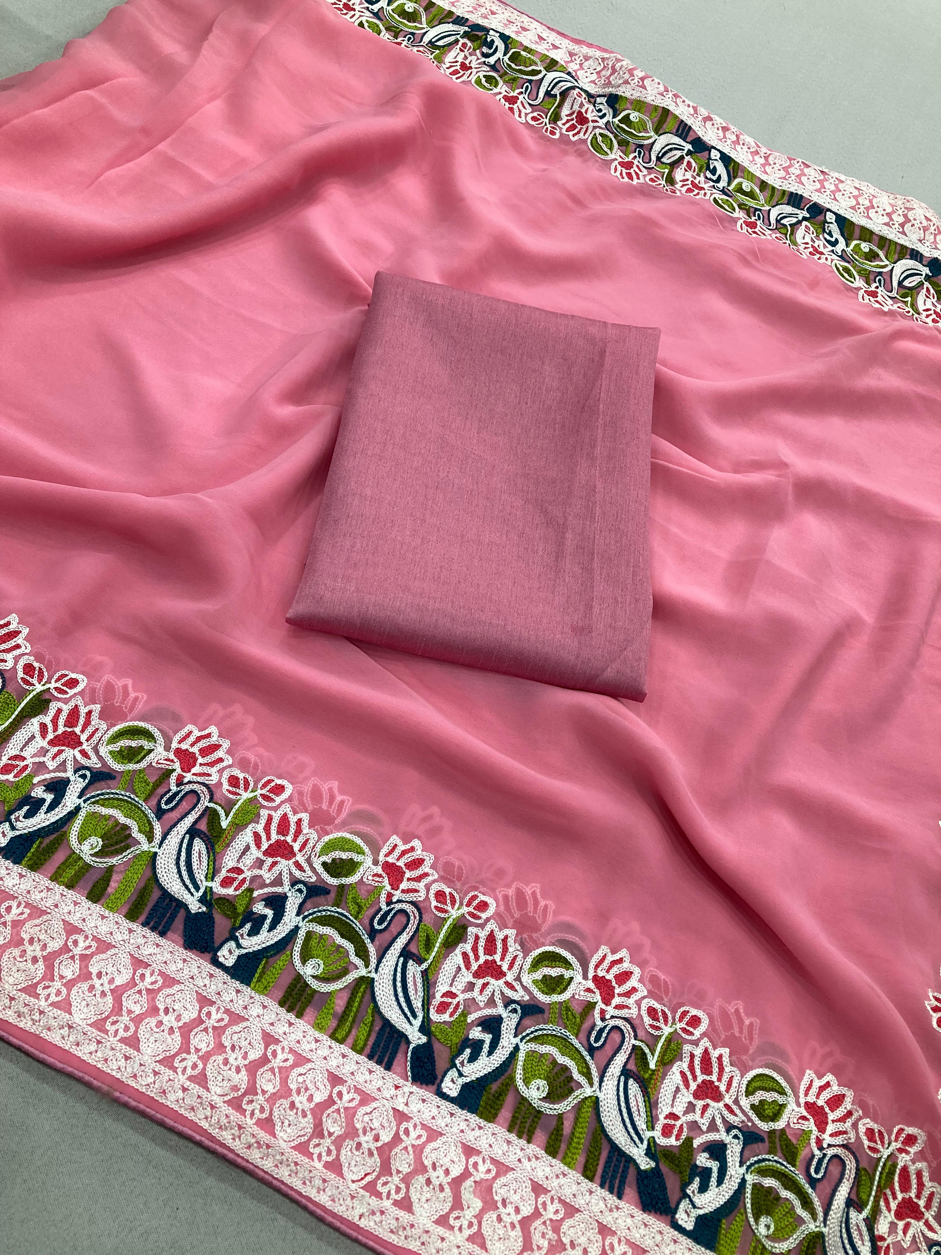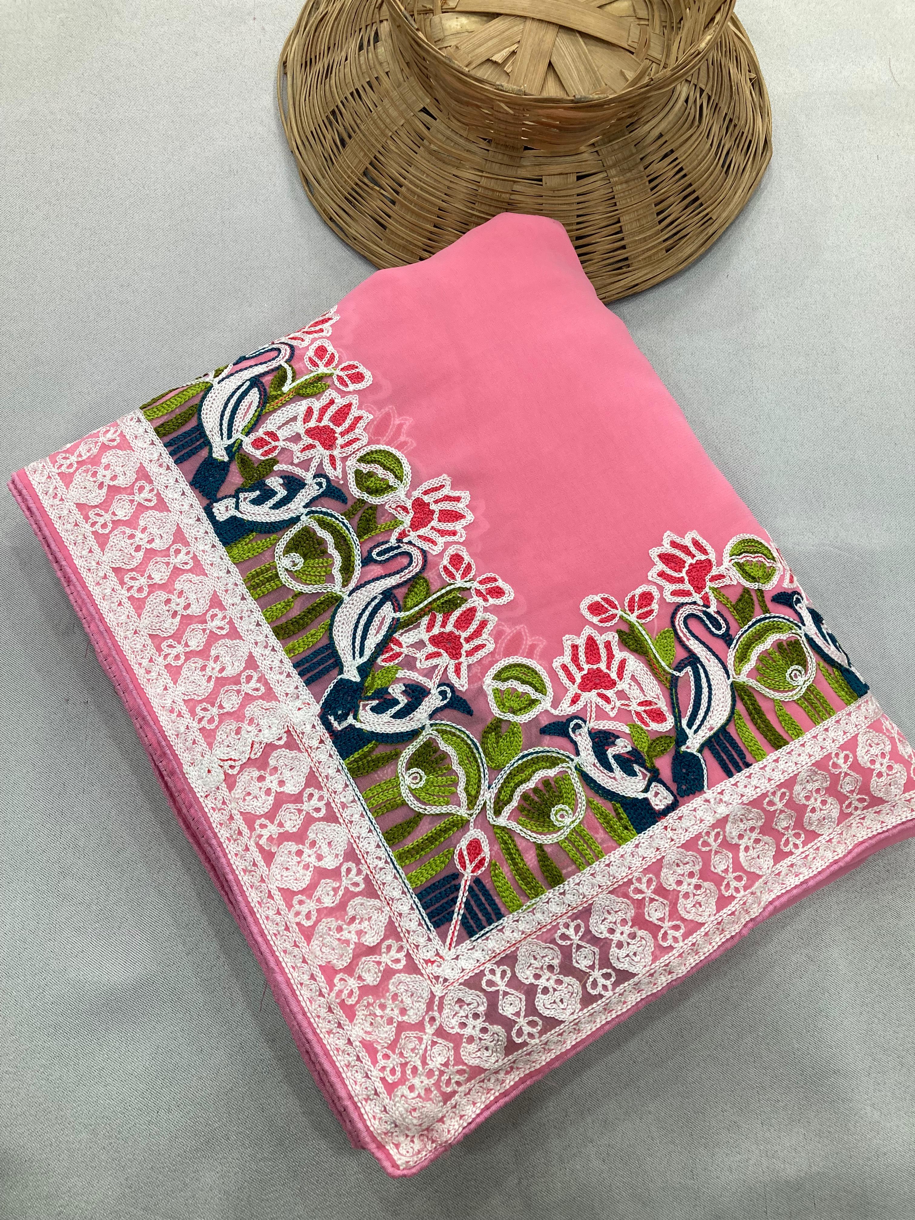 Looking some one for this same colour beautiful Saree for wedding on premium Soft georgette fabric with Embroidery Work Lace Border With Heavy Embroidery Work blouse Peice.