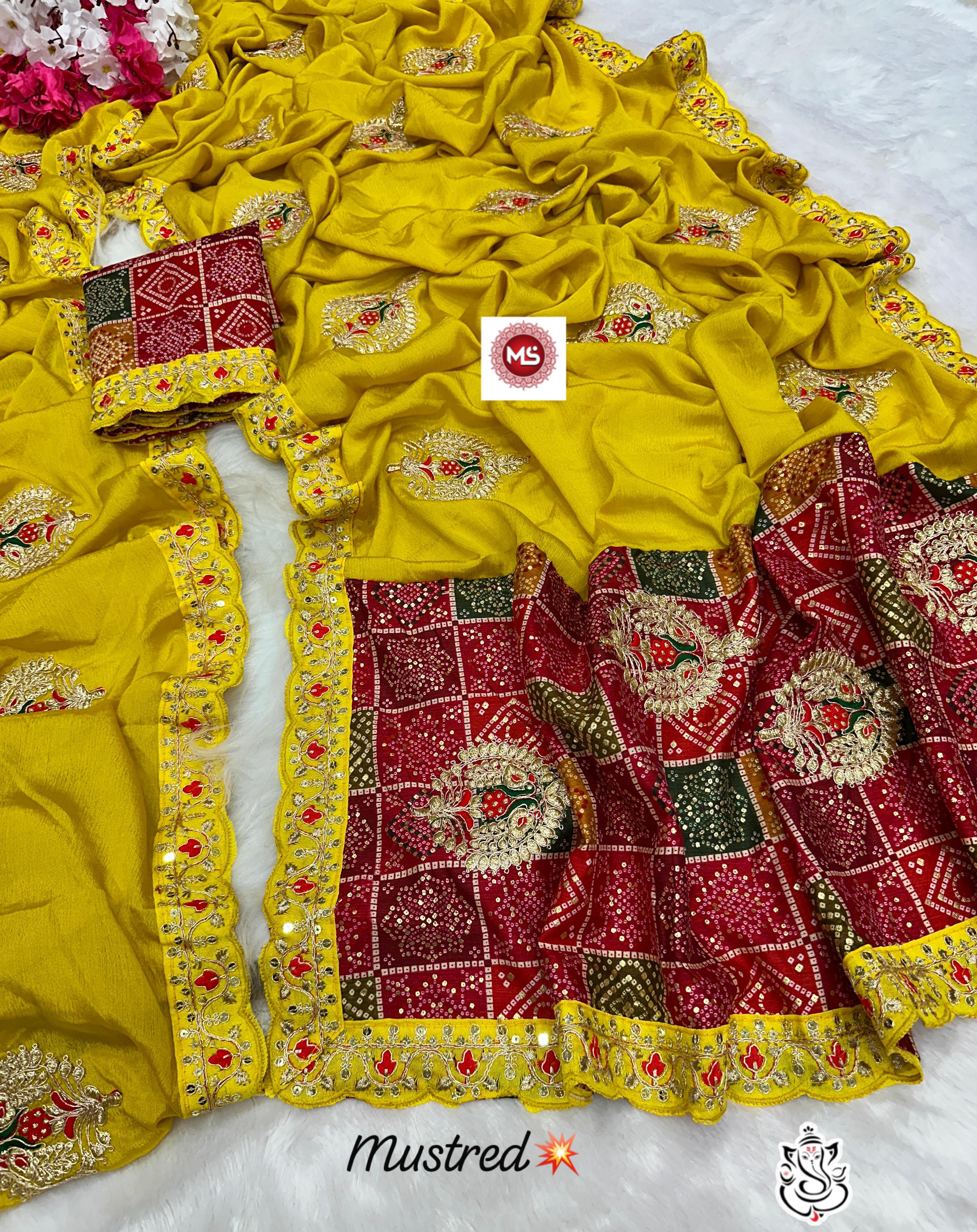 Fabric nd work - beautiful soft chinon fabric saree with rich look Riyon silk short pallu with cutpaste heavy embroidery work in whole saree & heavy rich coding sequence pallu