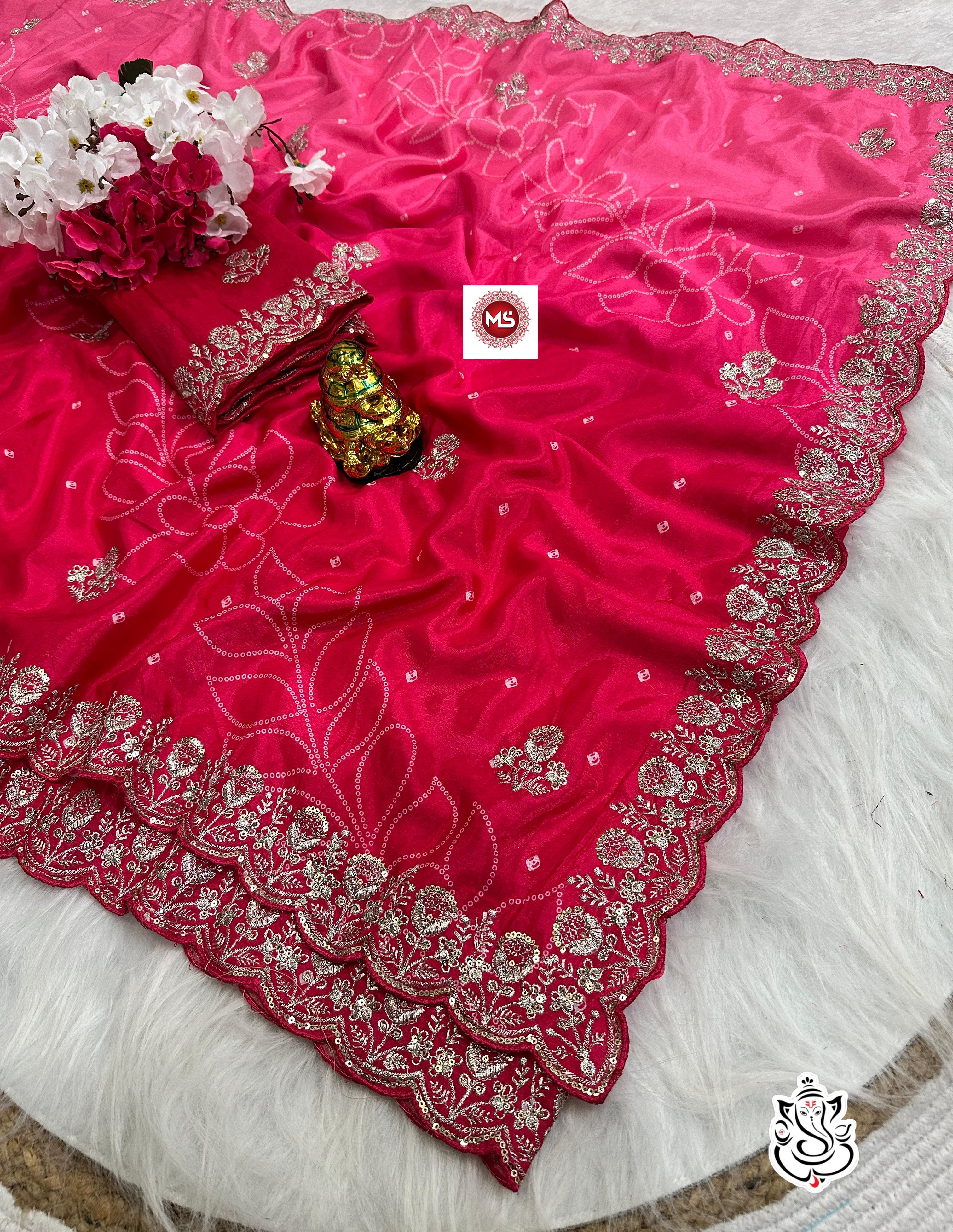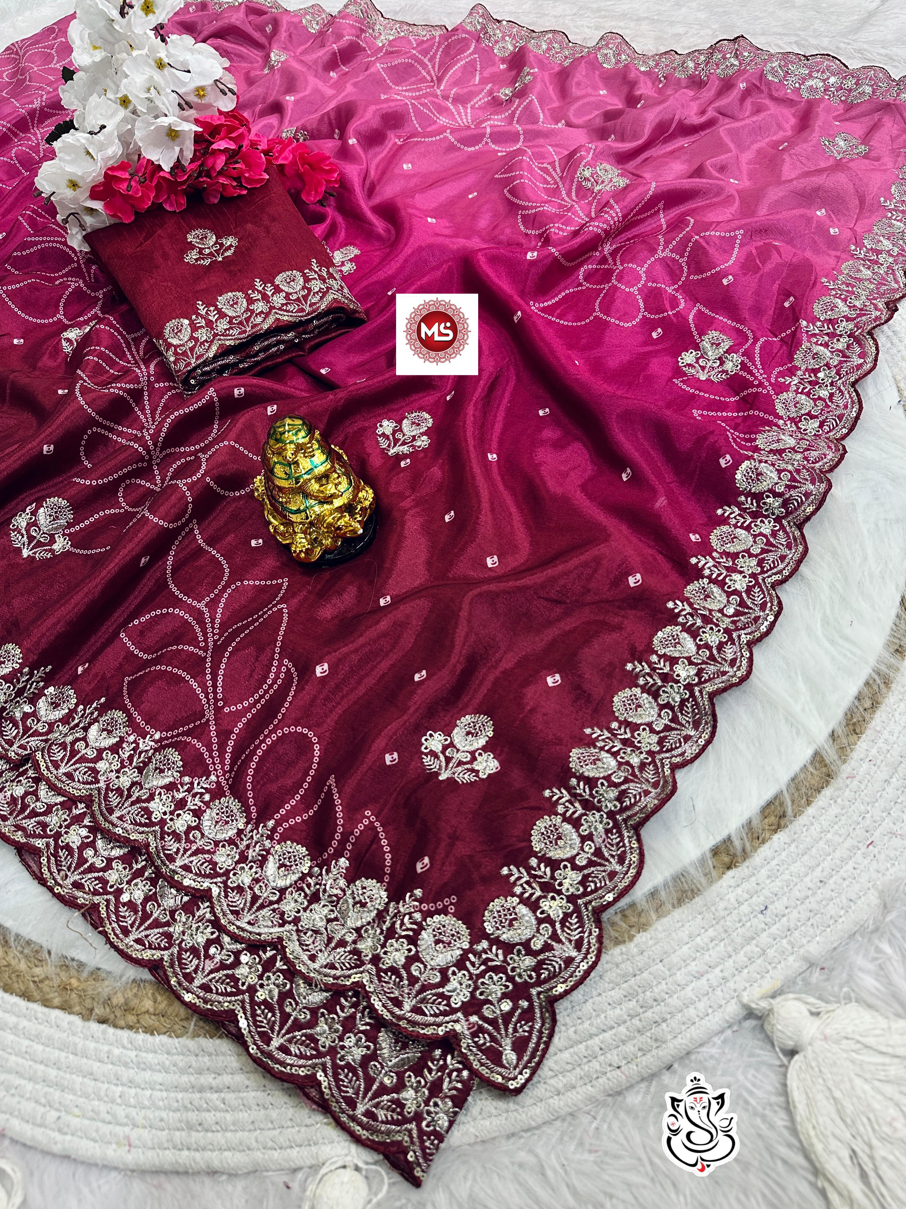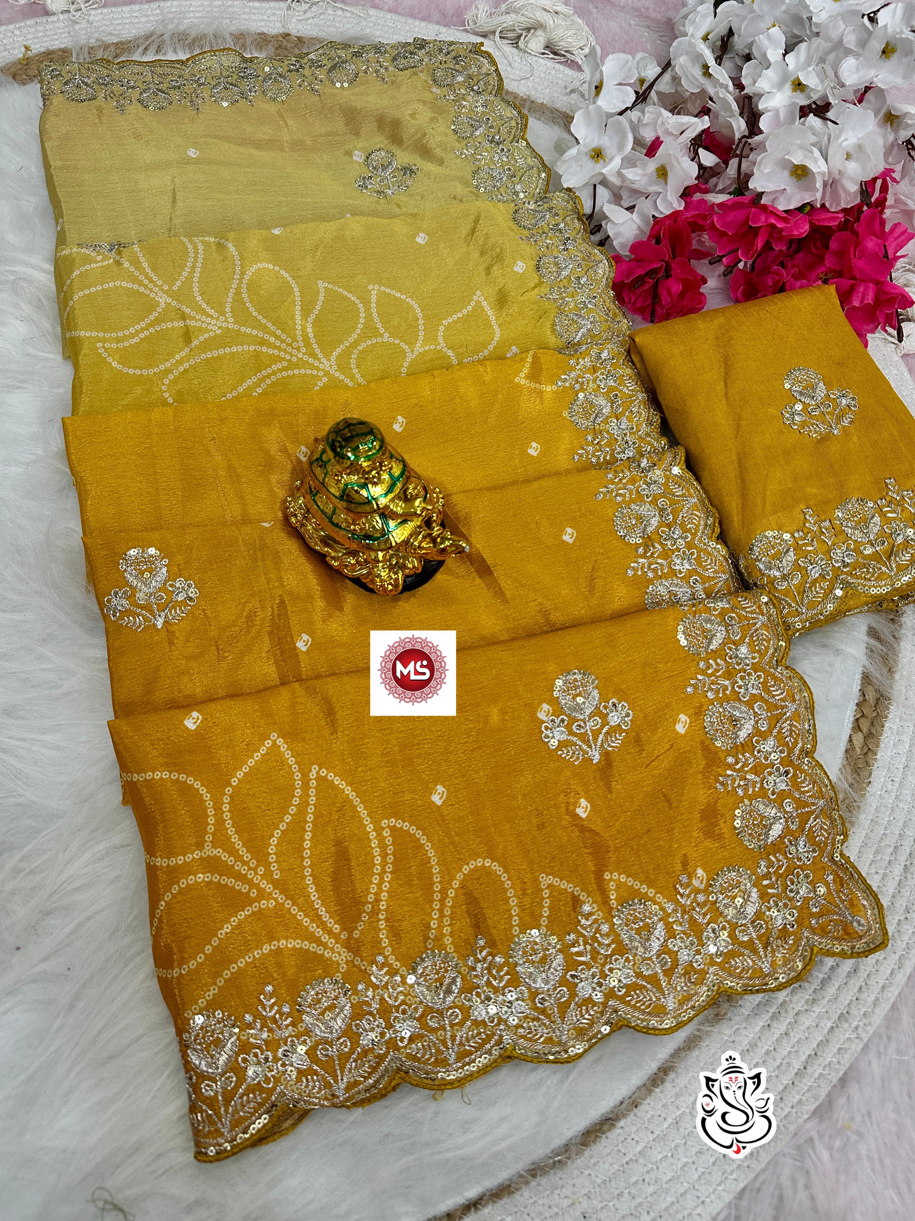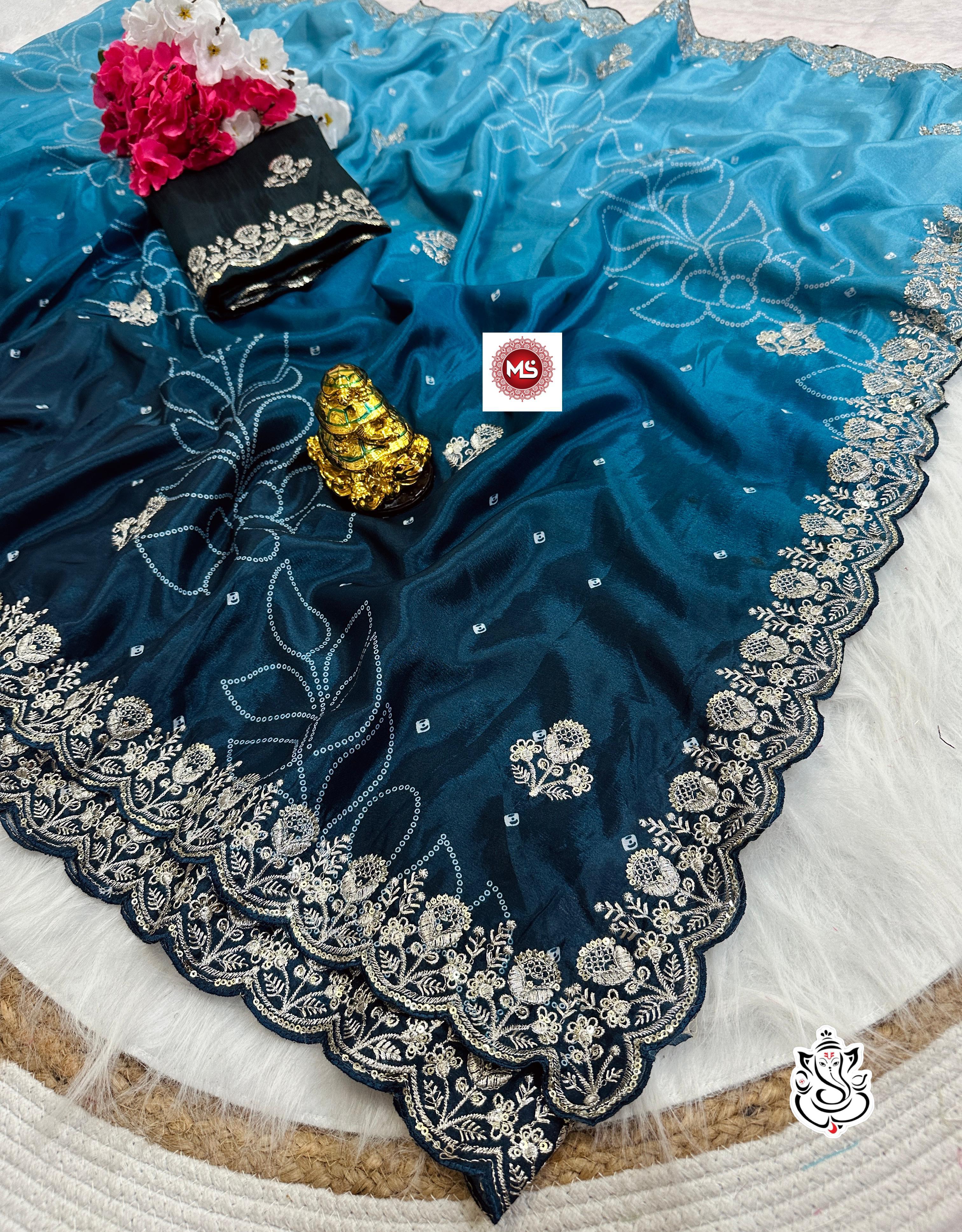 Fabric & details :- soft chinon silk digital print saree with heavy c-pallu seqance zari work with butti in whole saree & cut work border