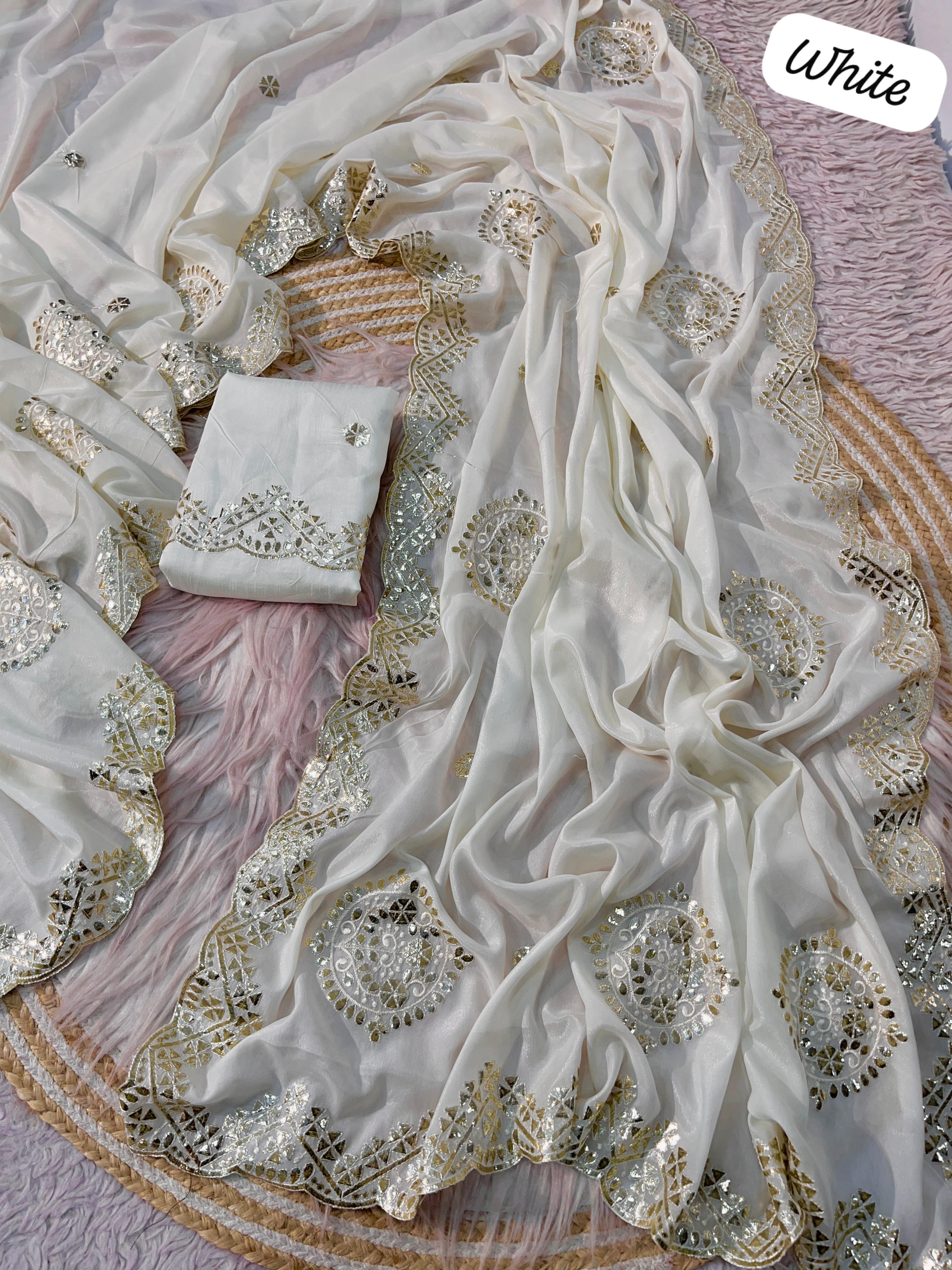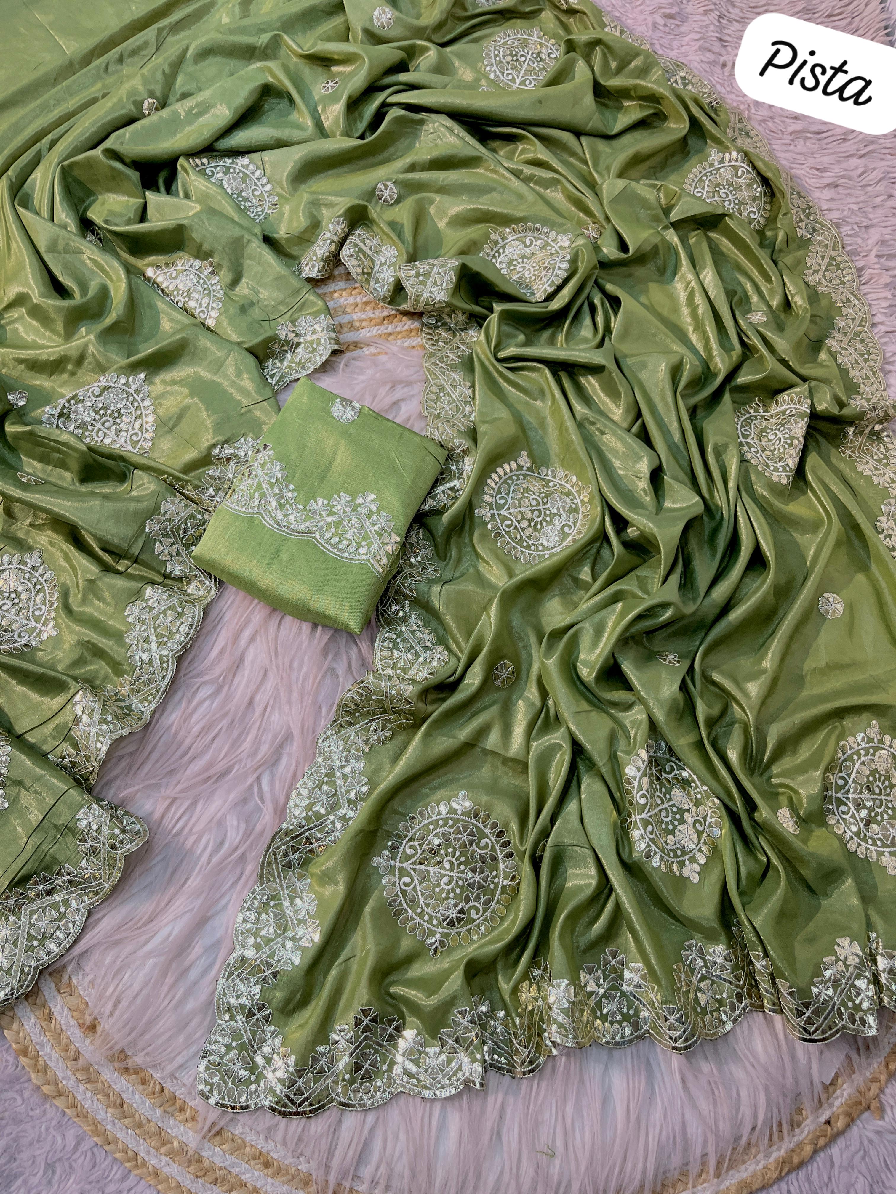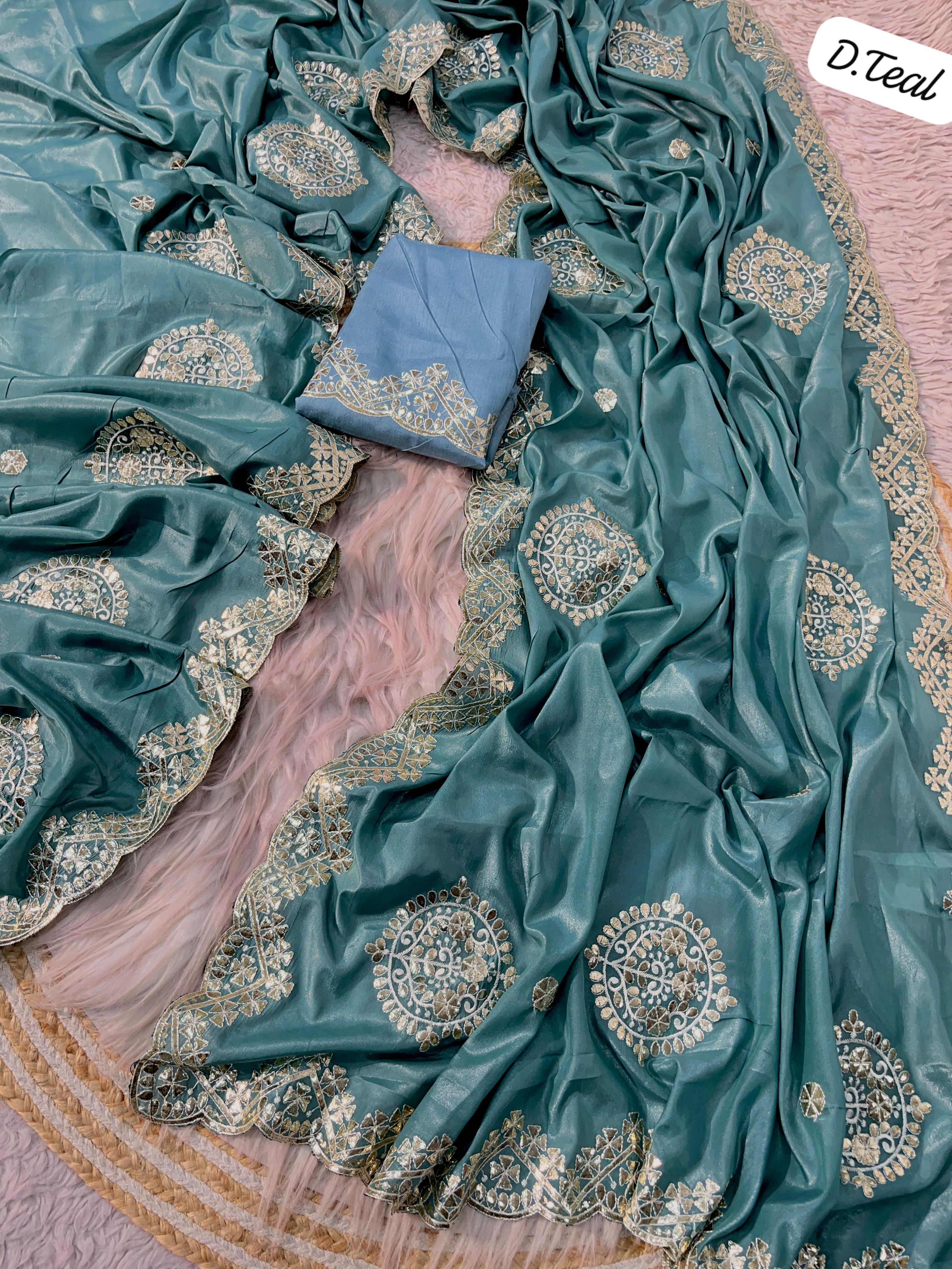 Fabric nd work :- beautiful soft shine chocolate silk saree with rich look c-pallu foilgotapatti work nd butta in whole saree with cut work