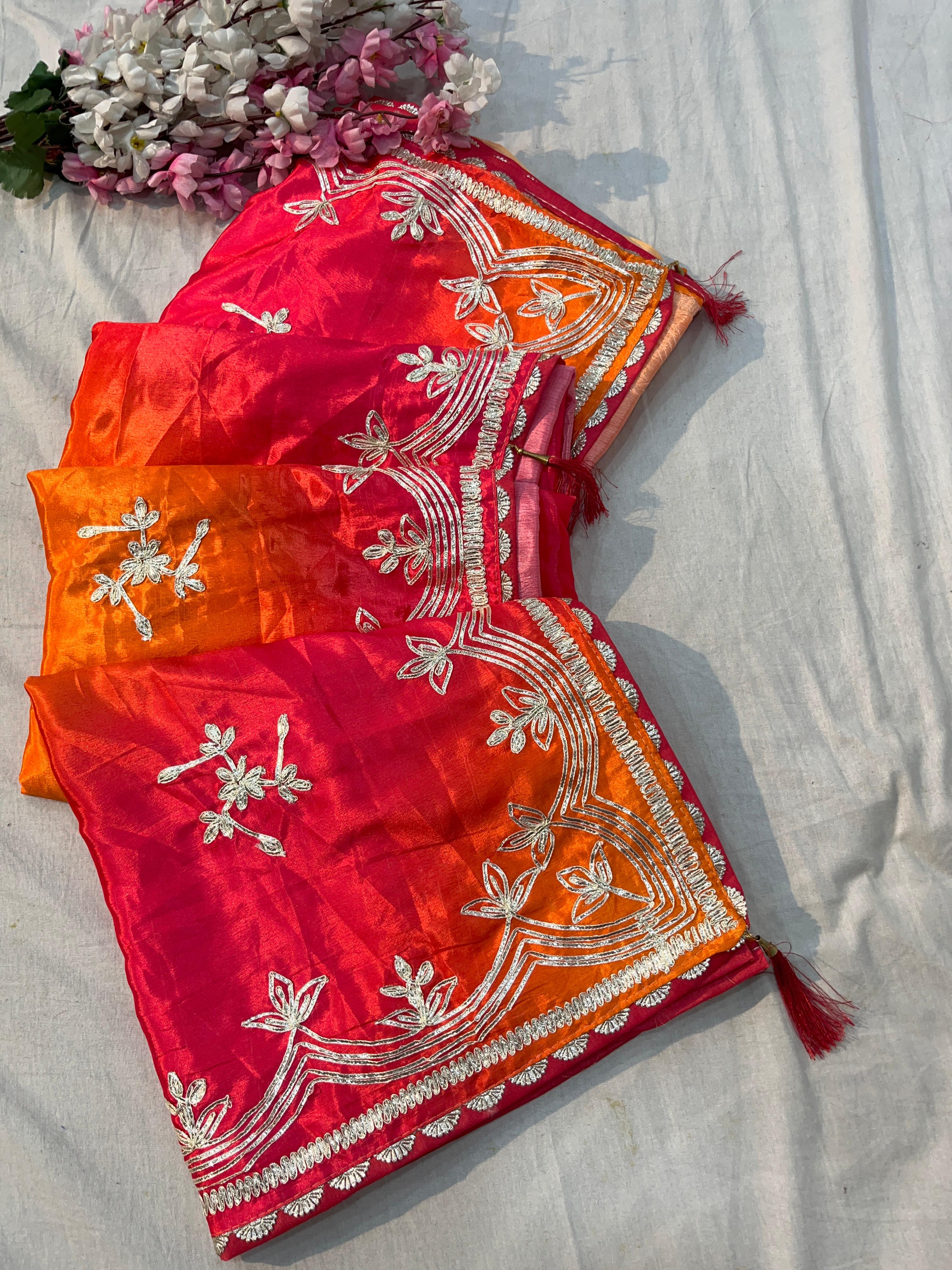 Fabric & work :- beautiful chinon digital peding saree with heavy c-pallu ribbon gotapatti work with rich look border nd latkan