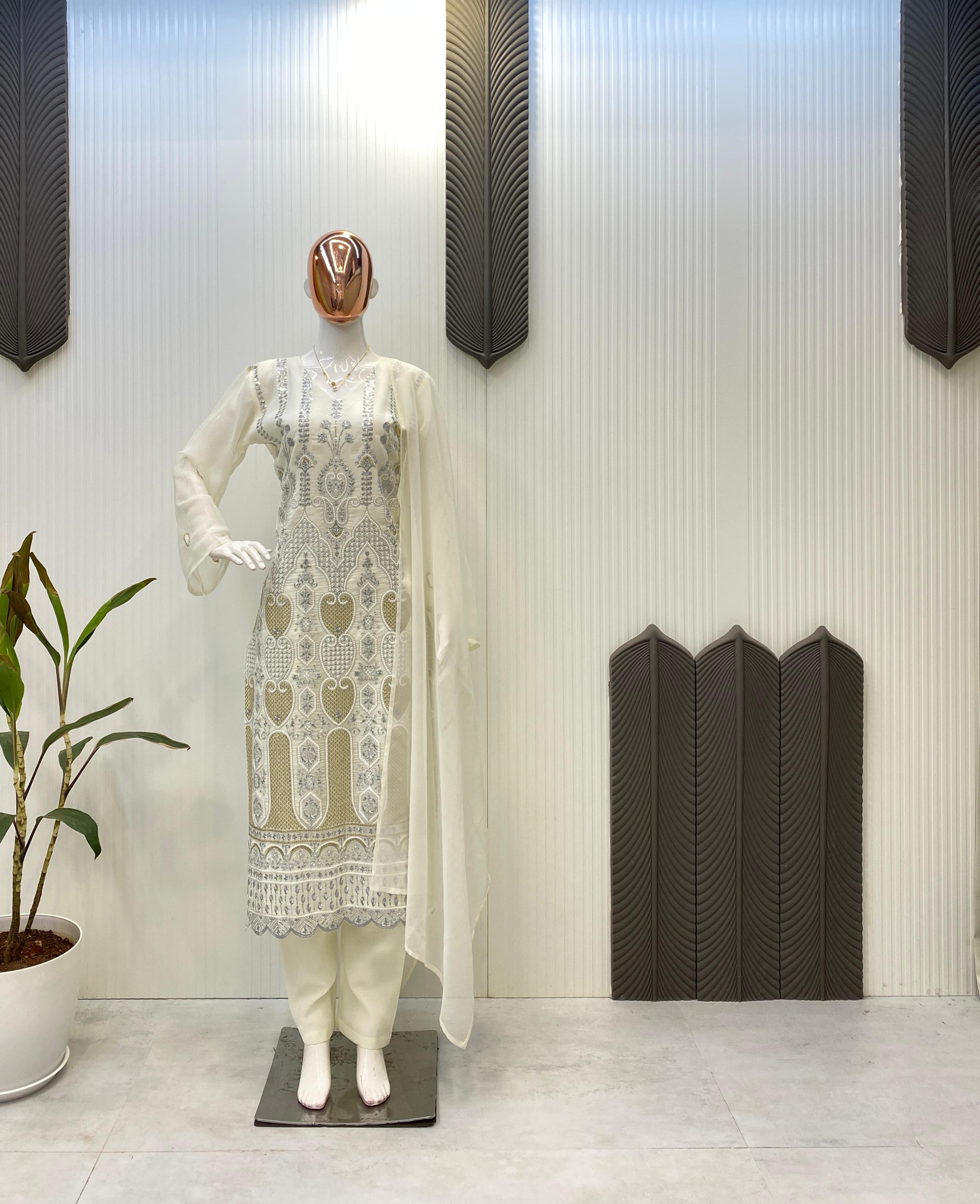 DESIRABLE FANCY FAUX GEORGETTE SEQUENCE EMBROIDERED WORK TOP AND PENT WITH DUPATTA