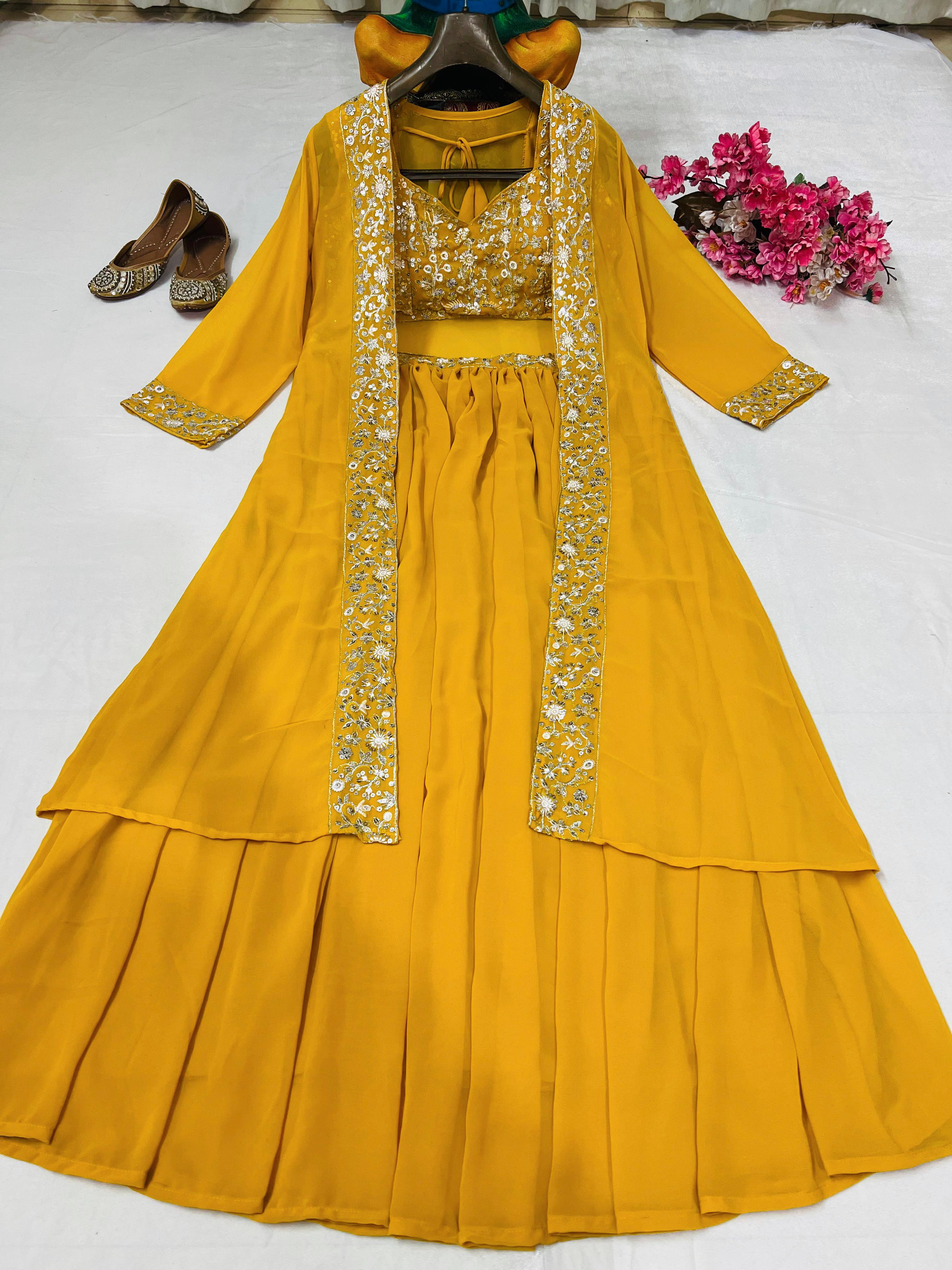 ❤️💐 Elegant mustard yellow Embroidered indowestern lehenga Set – Perfect Blend of Tradition & Style, which Enhance the beauty of your wardrobe 💐❤️