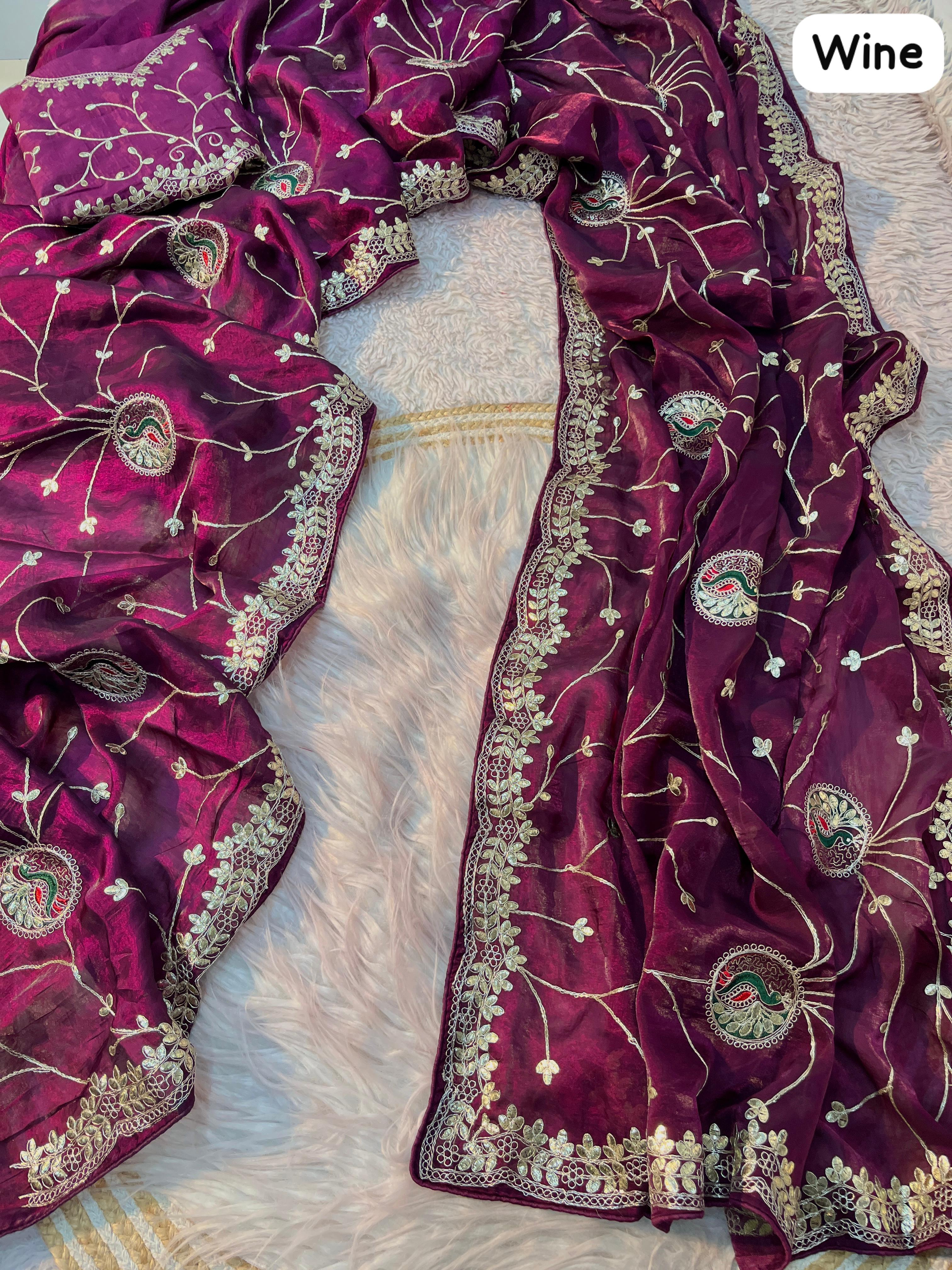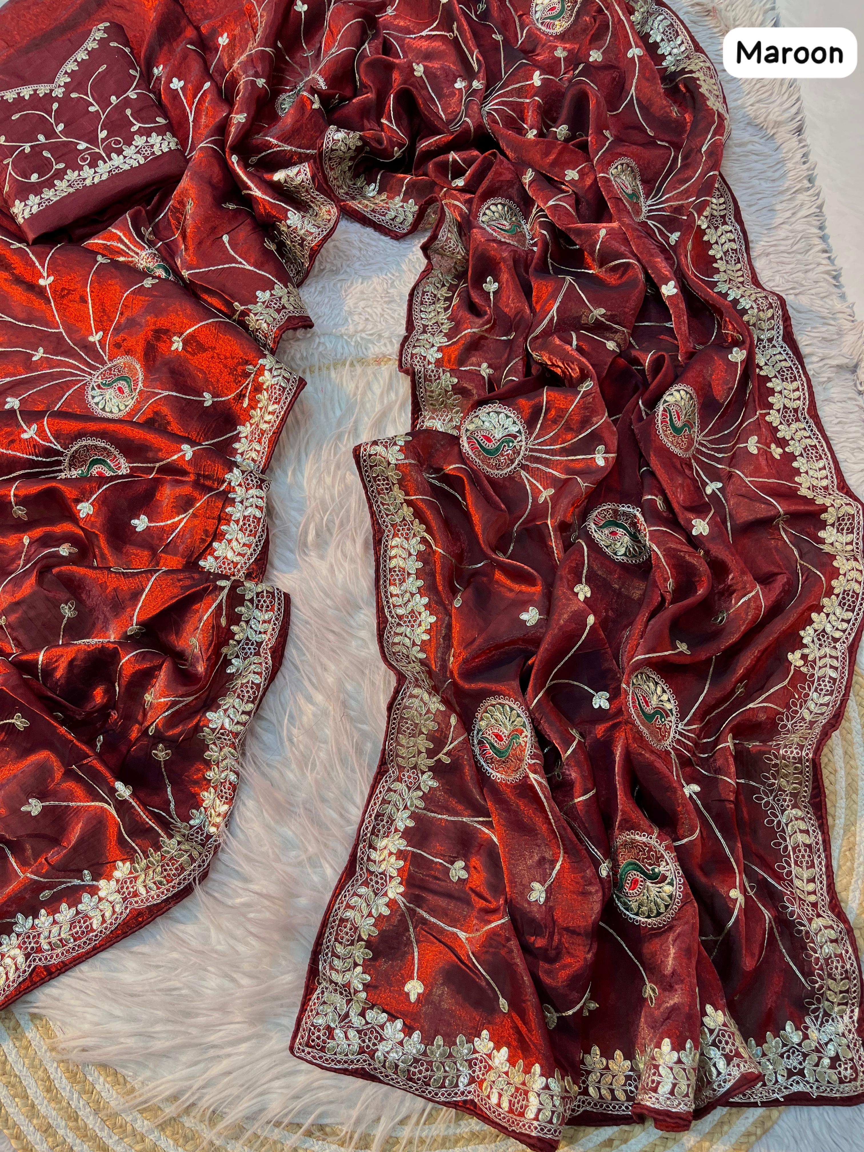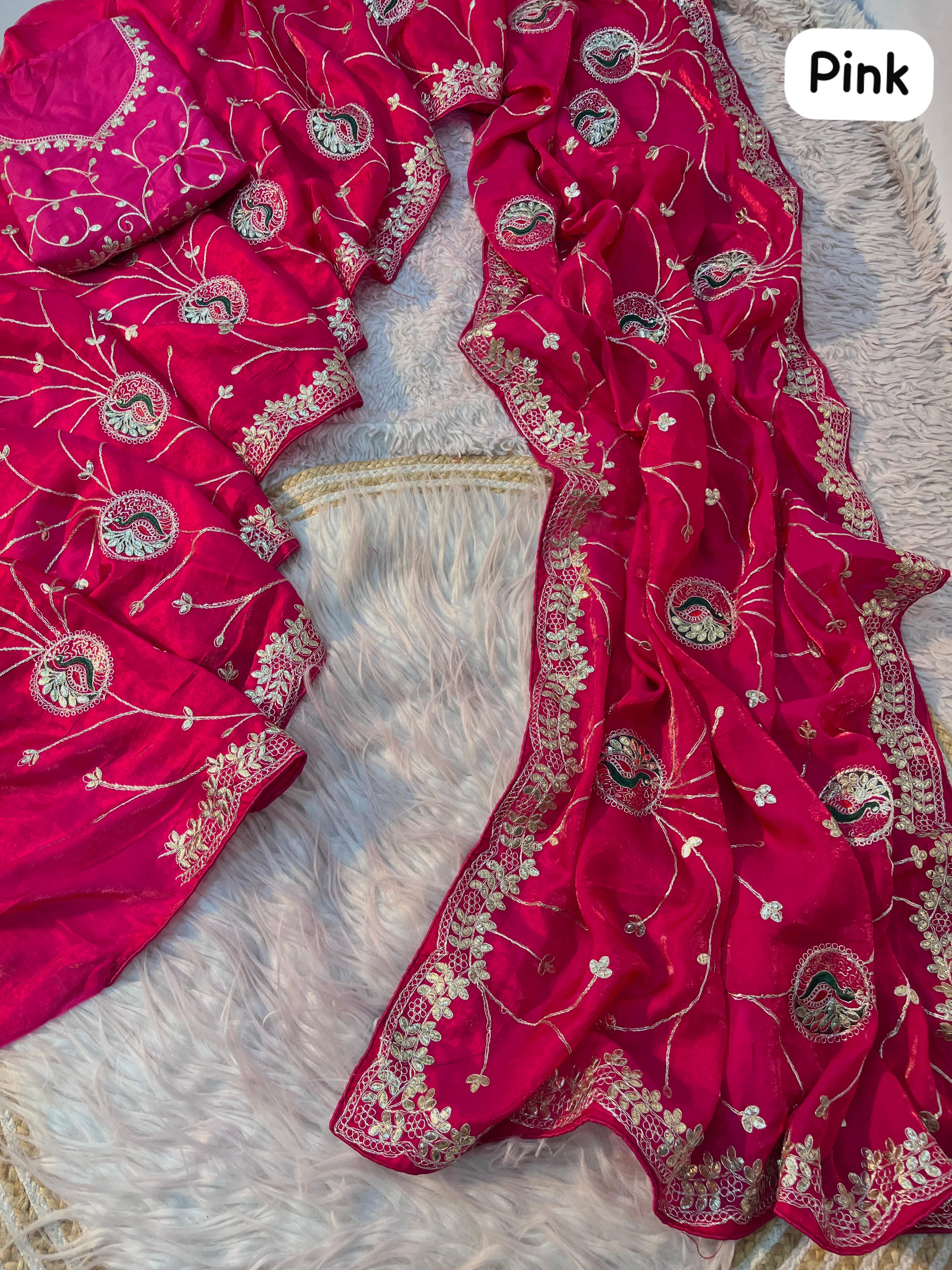 Work :- beautiful heavy c-pallu gotafoil work intracte with zaal work in whole saree with rich look multi peocock butta all over the saree