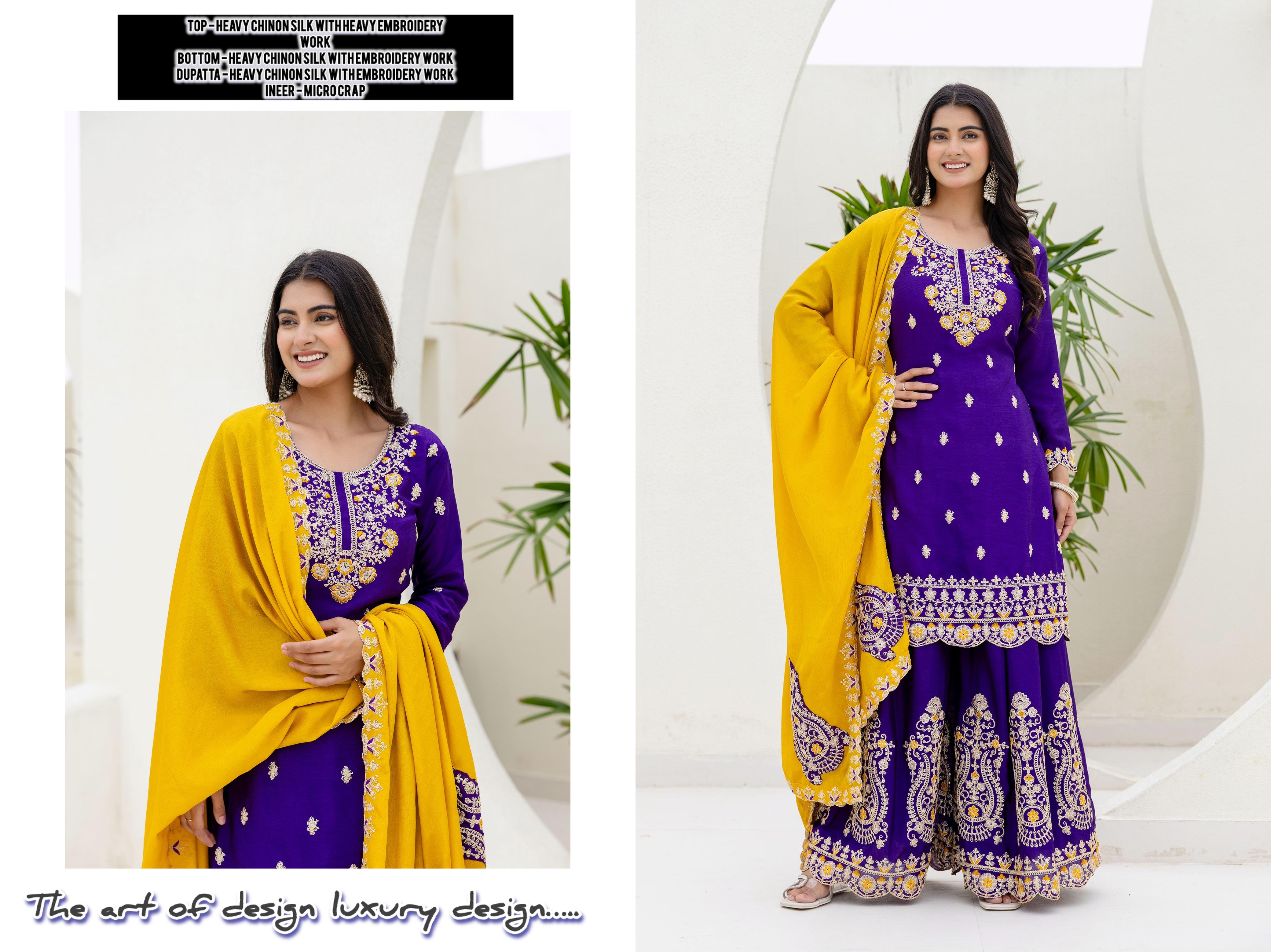 Dripping in luxury with this stunning Heavy Chinon Silk ensemble. The exquisite embroidery work and vibrant colors make for a perfect festive or occasion look. The art of design, luxury design.