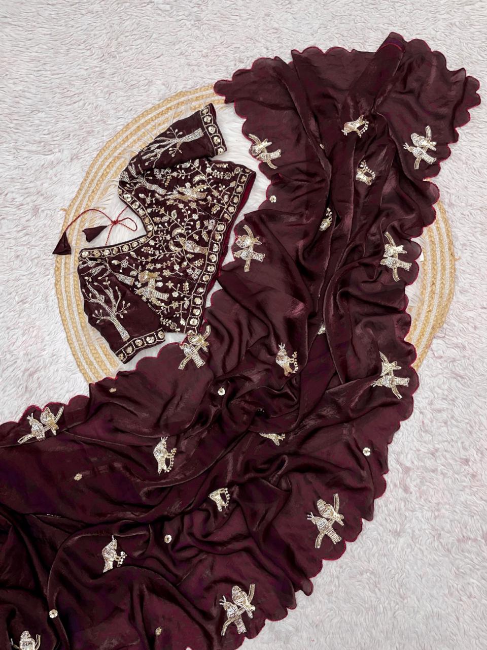 SAREE : PURE SOFT FANDY SATTIN SILK FABRIC ON BEAUTIFUL HAND WORK WITH CUT WORK AARKO BORDER IN SAREE