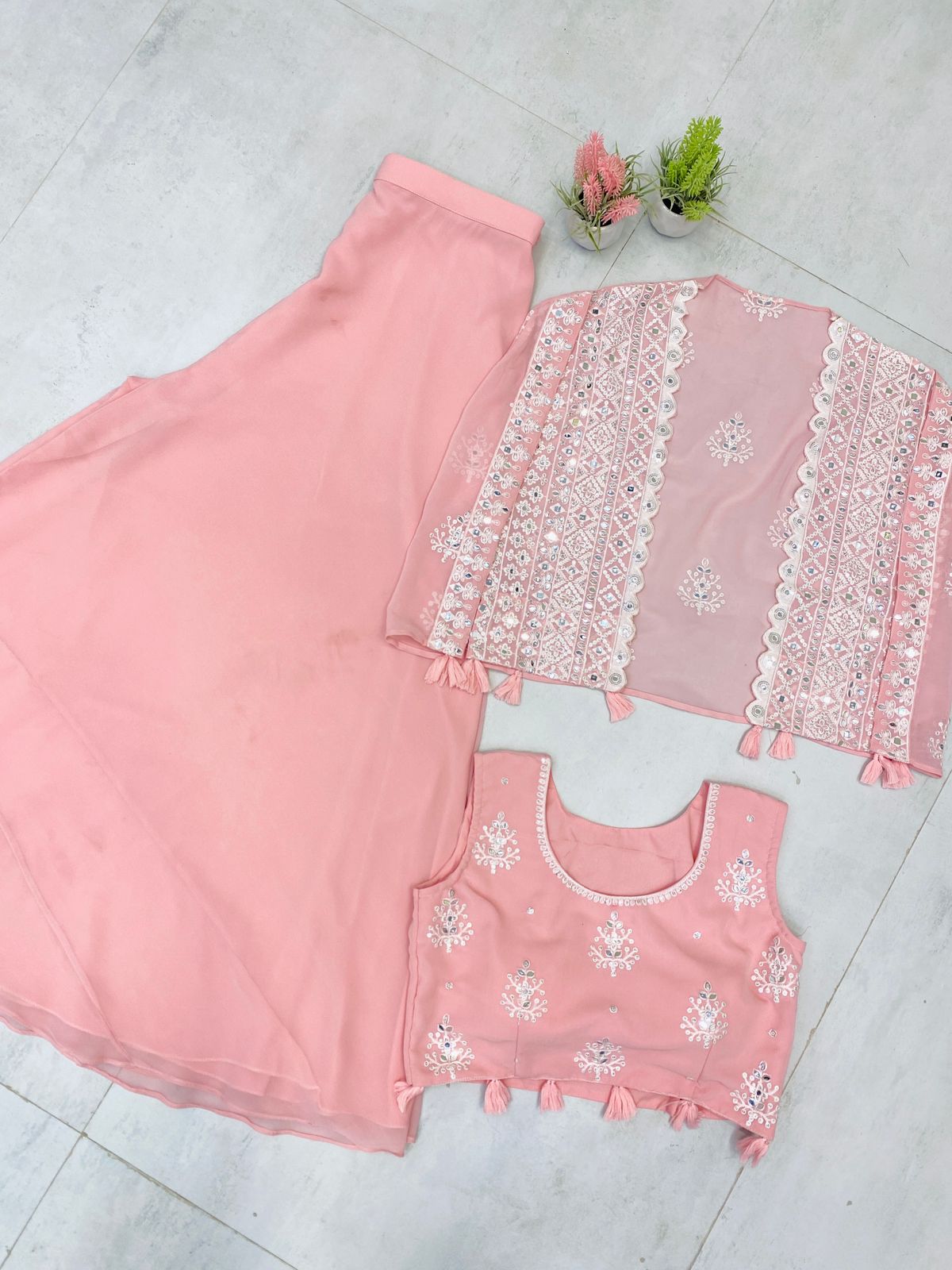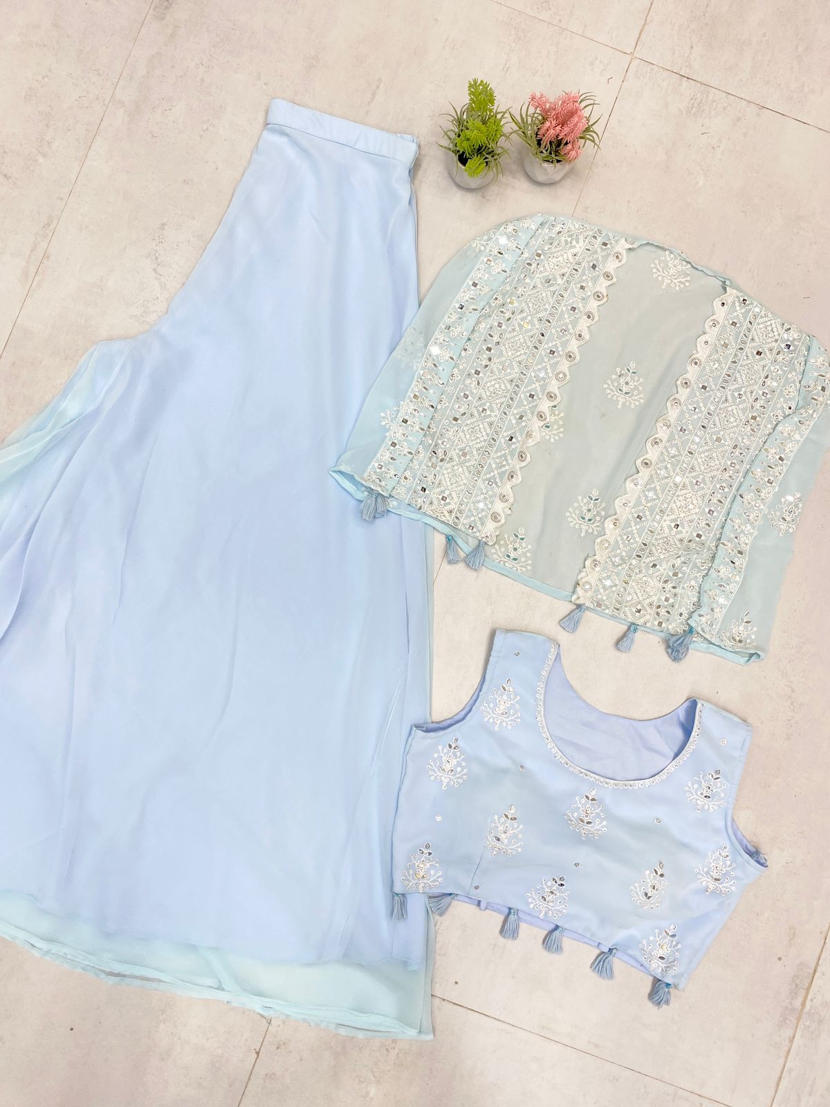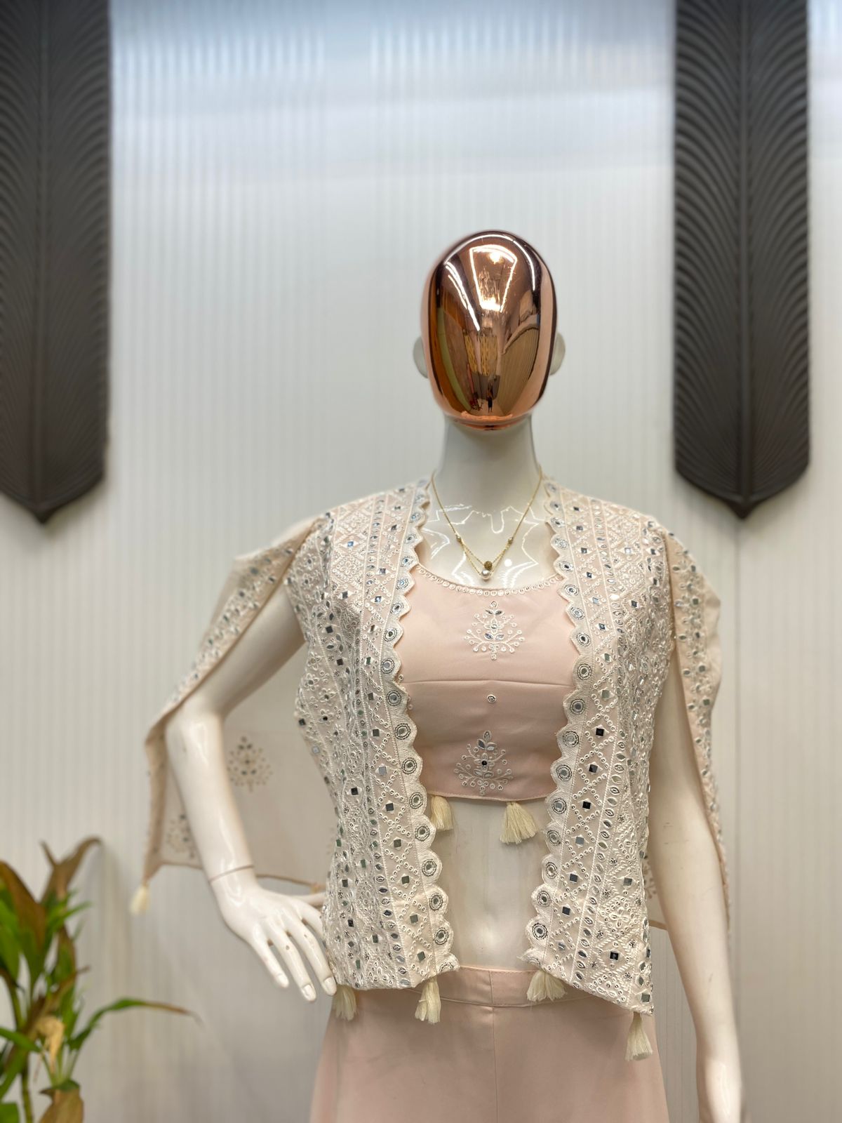 TRENDING PARTY WEAR THREE PIECE BLOUSE,PLAZZO AND SHRUGE WITH SEQUENCE EMBROIDERY REAL MIRROR WORK-CODE :-LG-1972